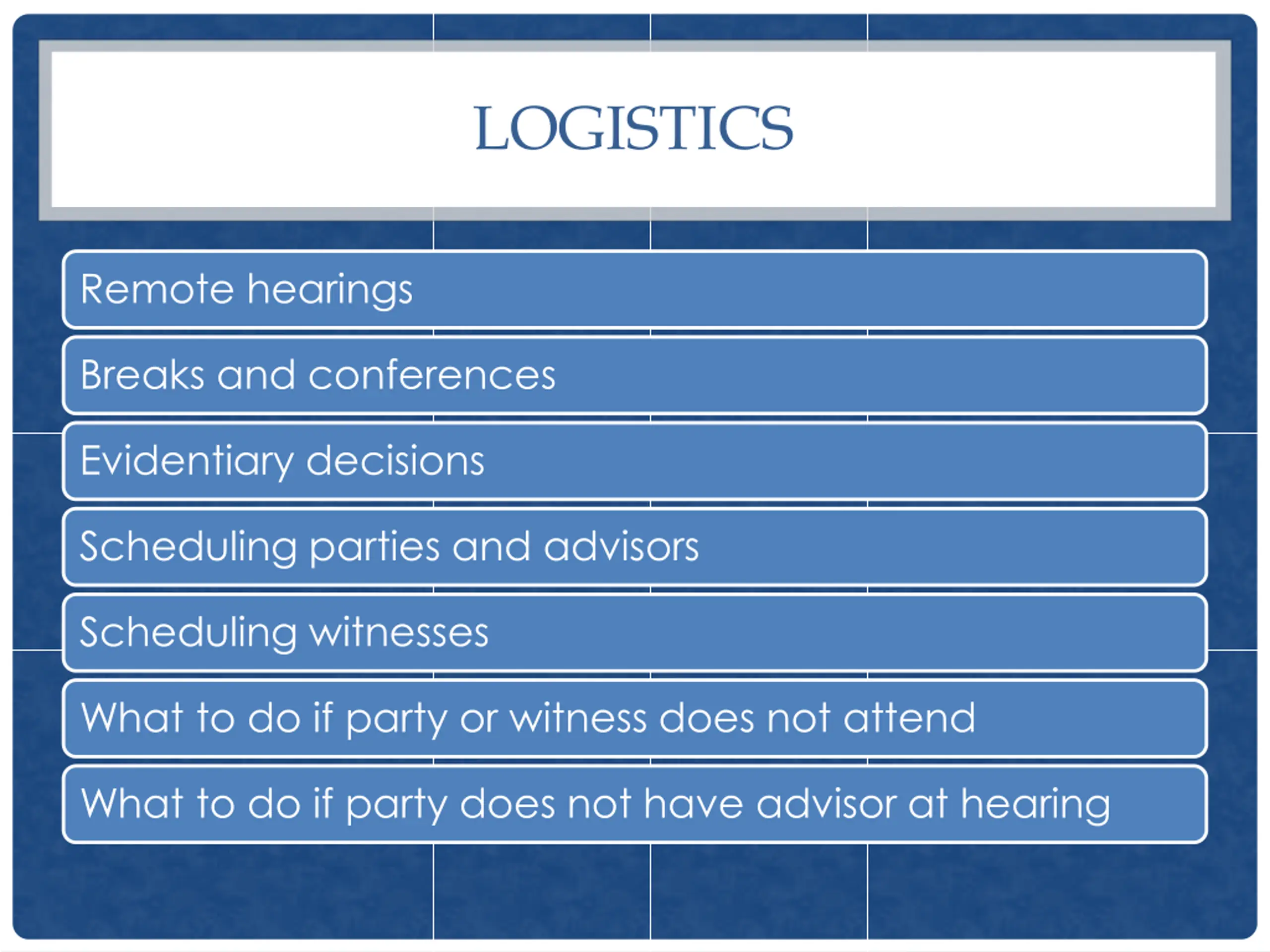 LOGISTICS Remote hearings Breaks and conferences Evidentiary decisions Scheduling parties and advisors Scheduling witnesses What to do if party or witness does not attend What to do if party does not have advisor at hearing