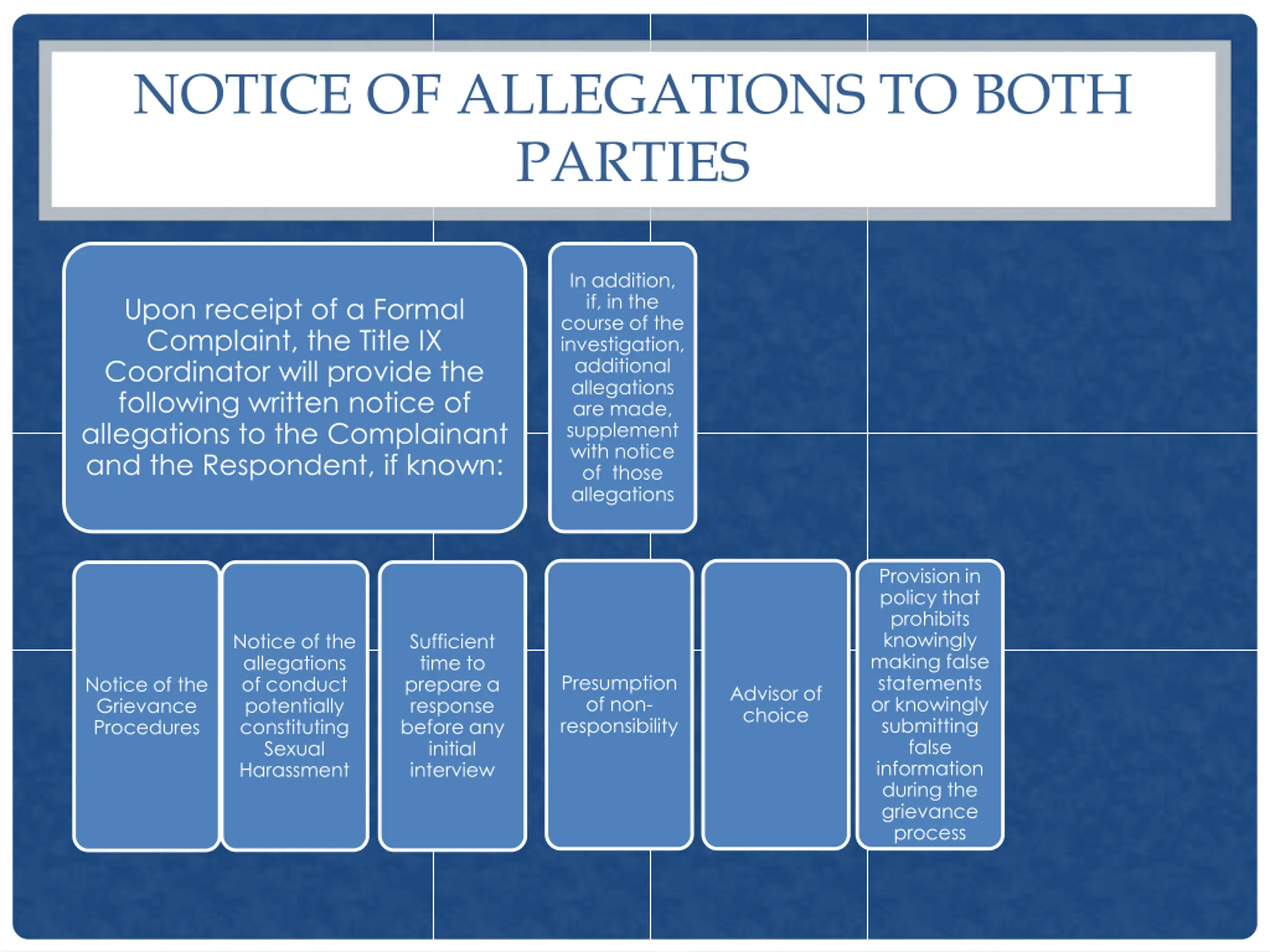 NOTICE OF ALLEGATIONS TO BOTH PARTIES In addition, if, in the course of the investigation, additional allegations are made, supplement with notice of those allegations Upon receipt of a Formal Complaint, the Title IX Coordinator will provide the following written notice of allegations to the Complainant and the Respondent, if known: Provision in policy that prohibits knowingly making false statements or knowingly submitting false information during the grievance process Notice of the allegations of conduct potentially constituting Sexual Harassment Sufficient time to prepare a response before any initial interview Presumption of non- responsibility Notice of the Grievance Procedures Advisor of choice