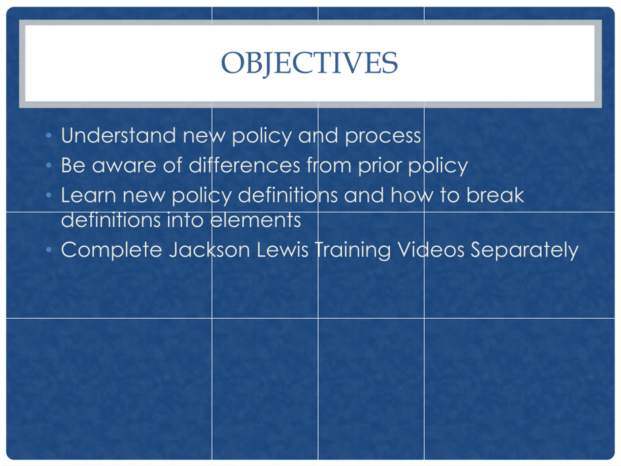 OBJECTIVES Understand new policy and process Be aware of differences from prior policy Learn new policy definitions and how to break definitions into elements Complete Jackson Lewis Training Videos Separately