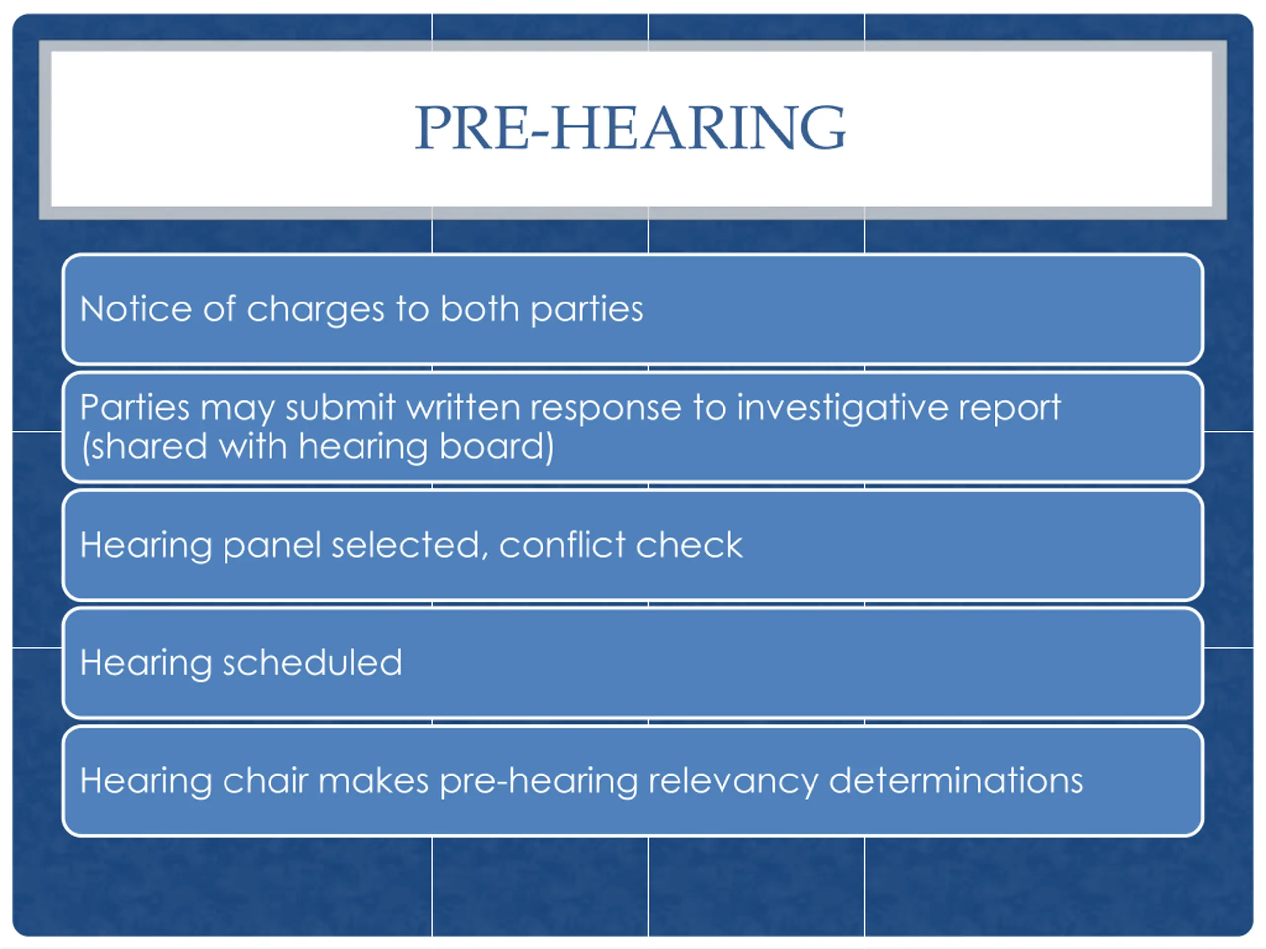 PRE-HEARING Notice of charges to both parties Parties may submit written response to investigative report (shared with hearing board) Hearing panel selected, conflict check Hearing scheduled Hearing chair makes pre-hearing relevancy determinations