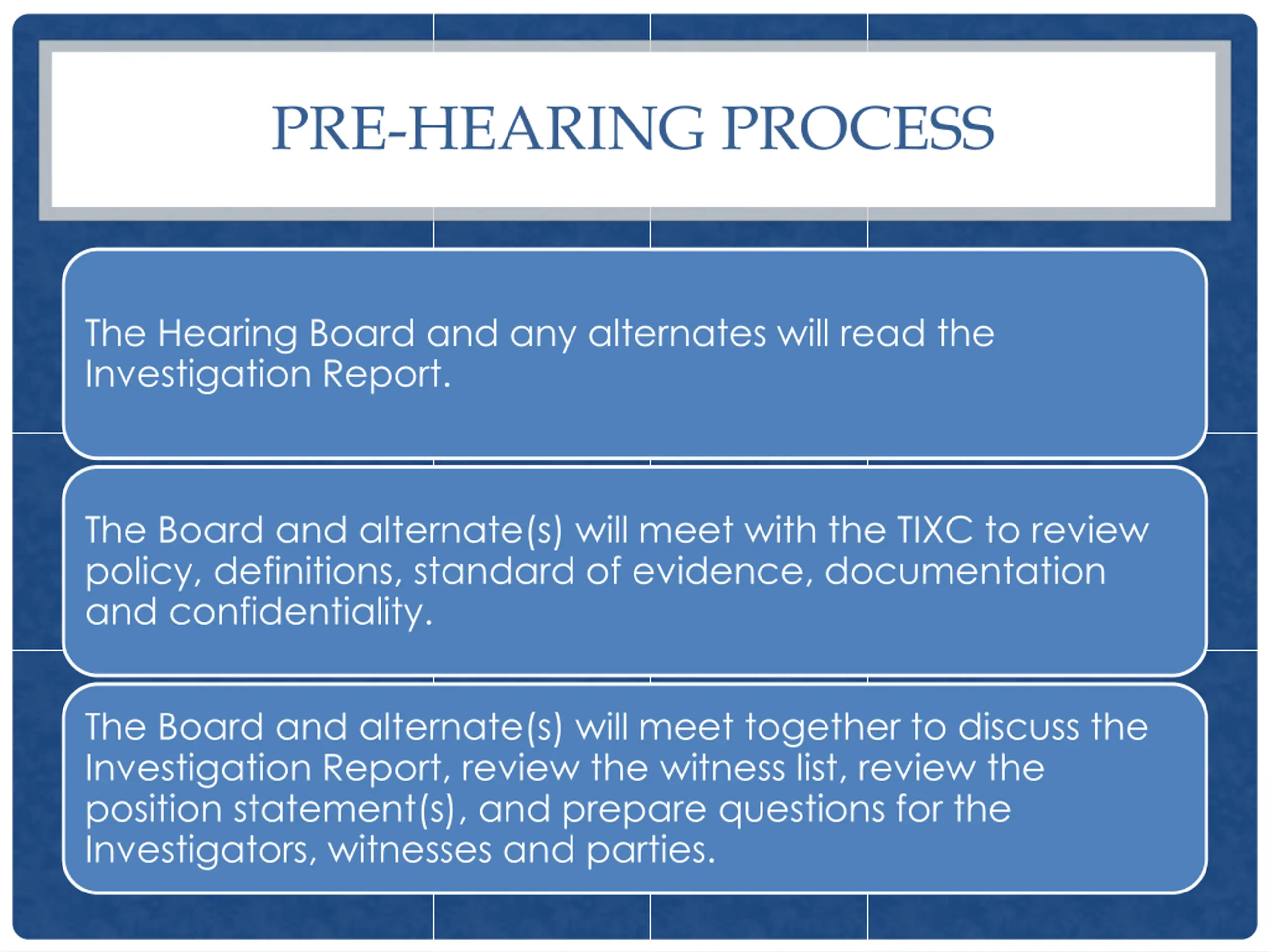 PRE-HEARING PROCESS The Hearing Board and any alternates will read the Investigation Report. The Board and alternate(s) will meet with the TIXC to review policy, definitions, standard of evidence, documentation and confidentiality. The Board and alternate(s) will meet together to discuss the Investigation Report, review the witness list, review the position statement(s), and prepare questions for the Investigators, witnesses and parties.