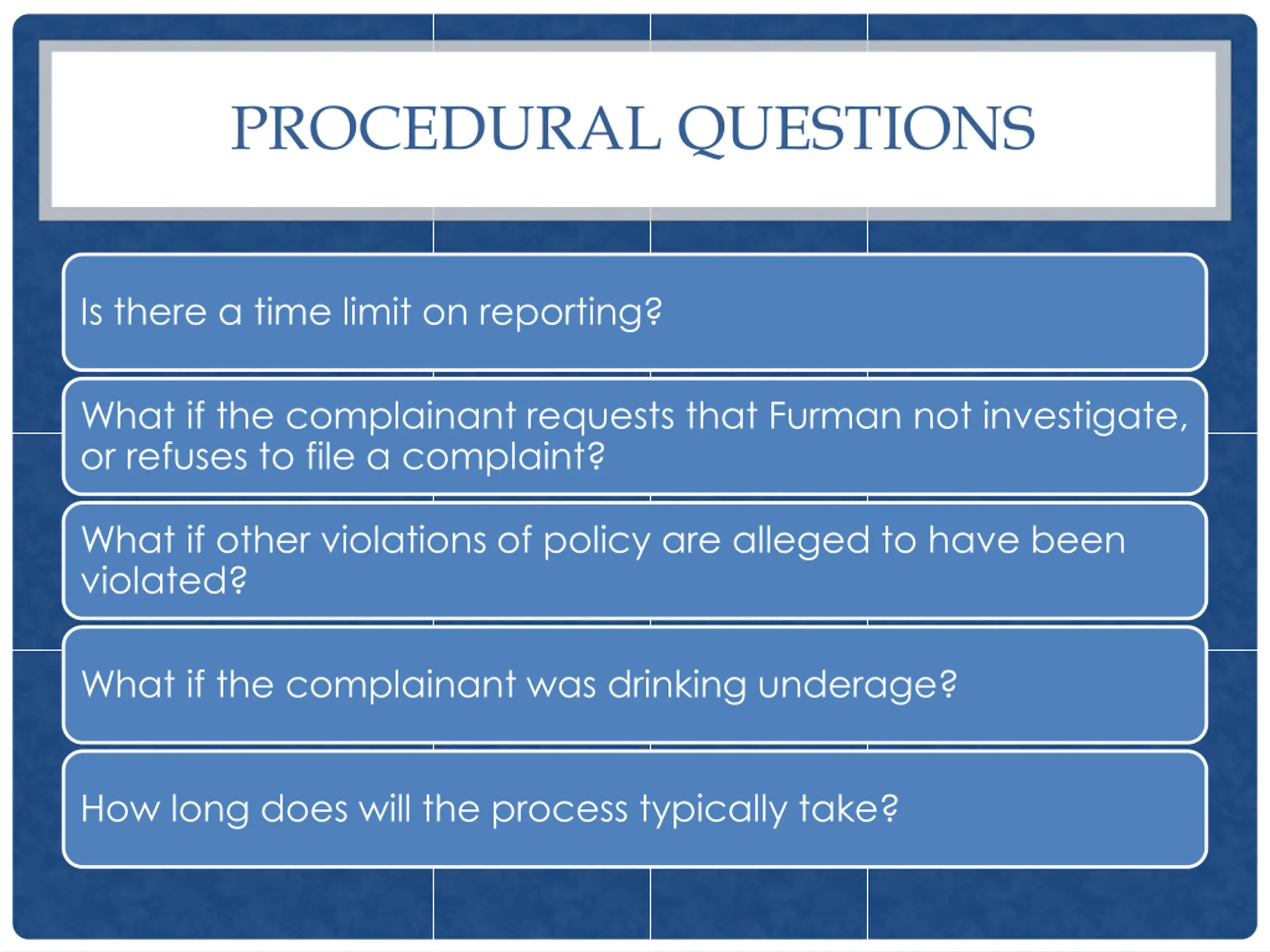 PROCEDURAL QUESTIONS Is there a time limit on reporting? What if the complainant requests that Furman not investigate, or refuses to file a complaint? What if other violations of policy are alleged to have been violated? What if the complainant was drinking underage? How long does will the process typically take?