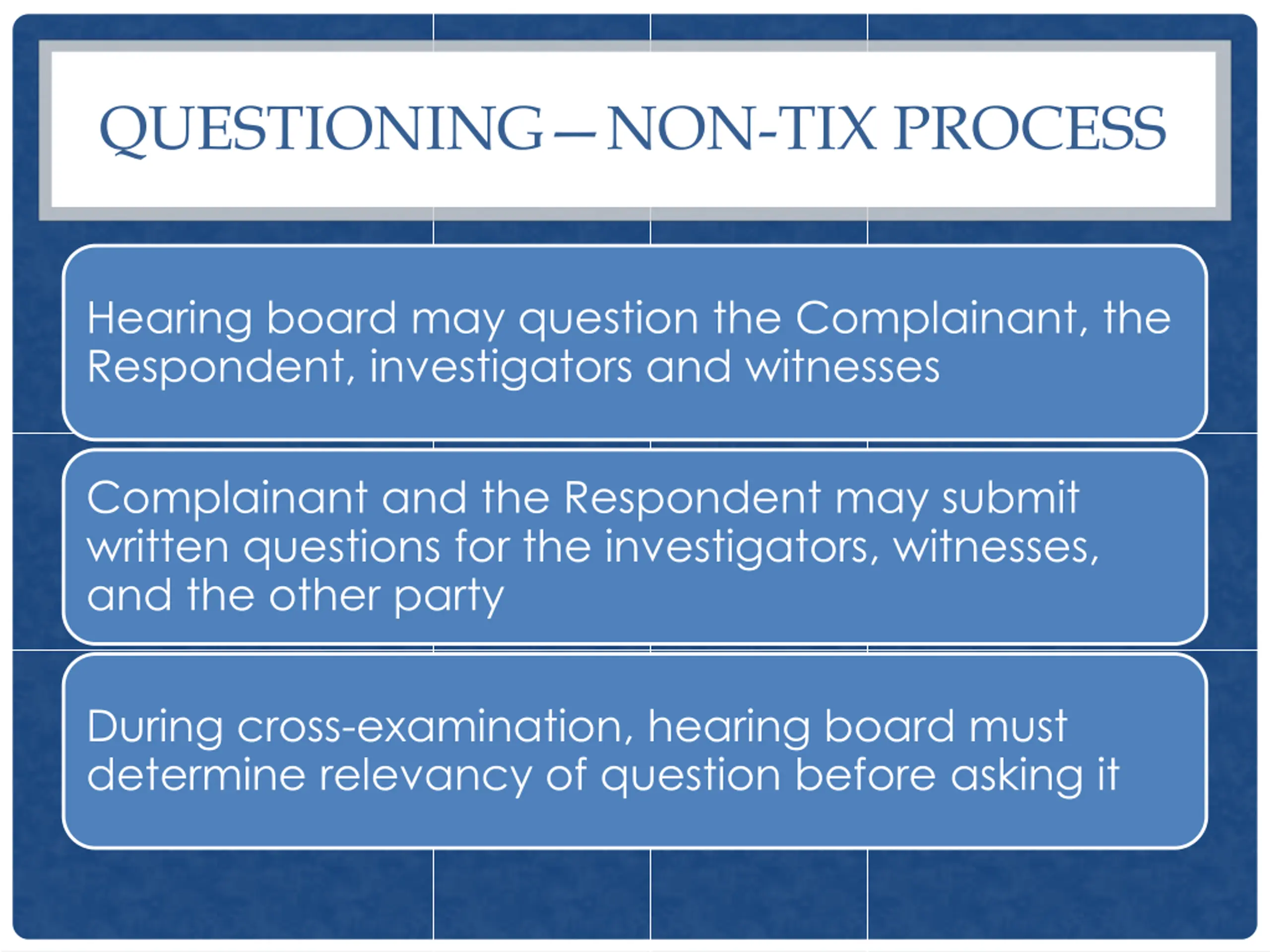 QUESTIONINGNON-TIX PROCESS Hearing board may question the Complainant, the Respondent, investigators and witnesses Complainant and the Respondent may submit written questions for the investigators, witnesses, and the other party During cross-examination, hearing board must determine relevancy of question before asking it