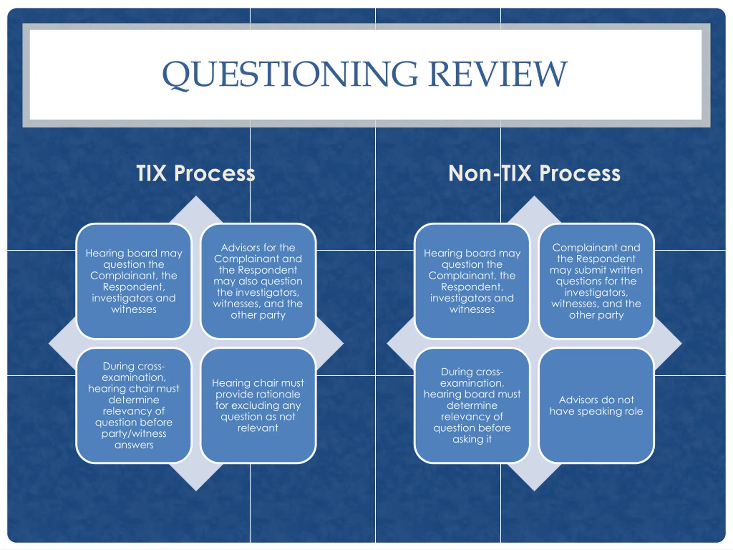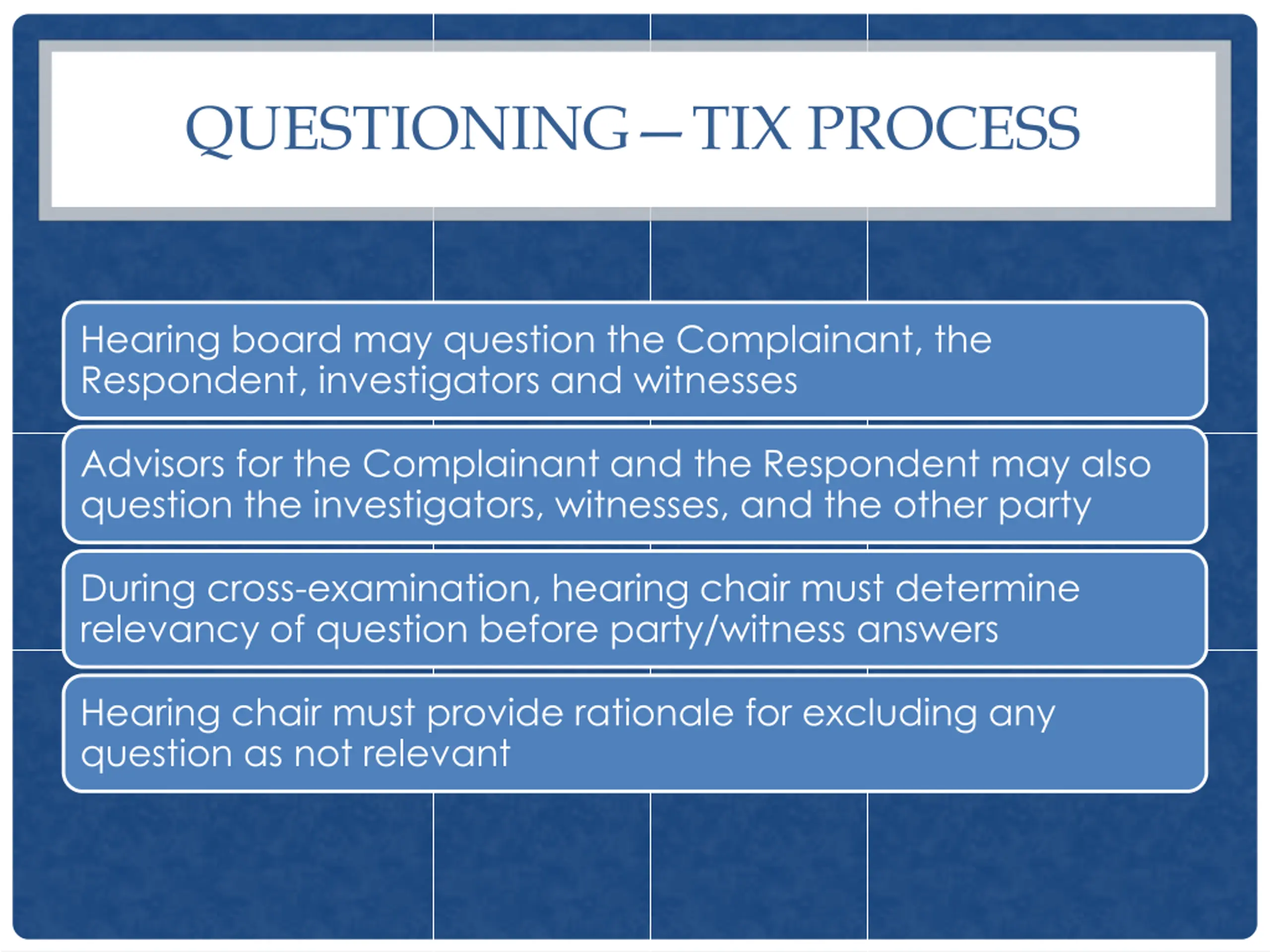 QUESTIONINGTIX PROCESS Hearing board may question the Complainant, the Respondent, investigators and witnesses Advisors for the Complainant and the Respondent may also question the investigators, witnesses, and the other party During cross-examination, hearing chair must determine relevancy of question before party/witness answers Hearing chair must provide rationale for excluding any question as not relevant
