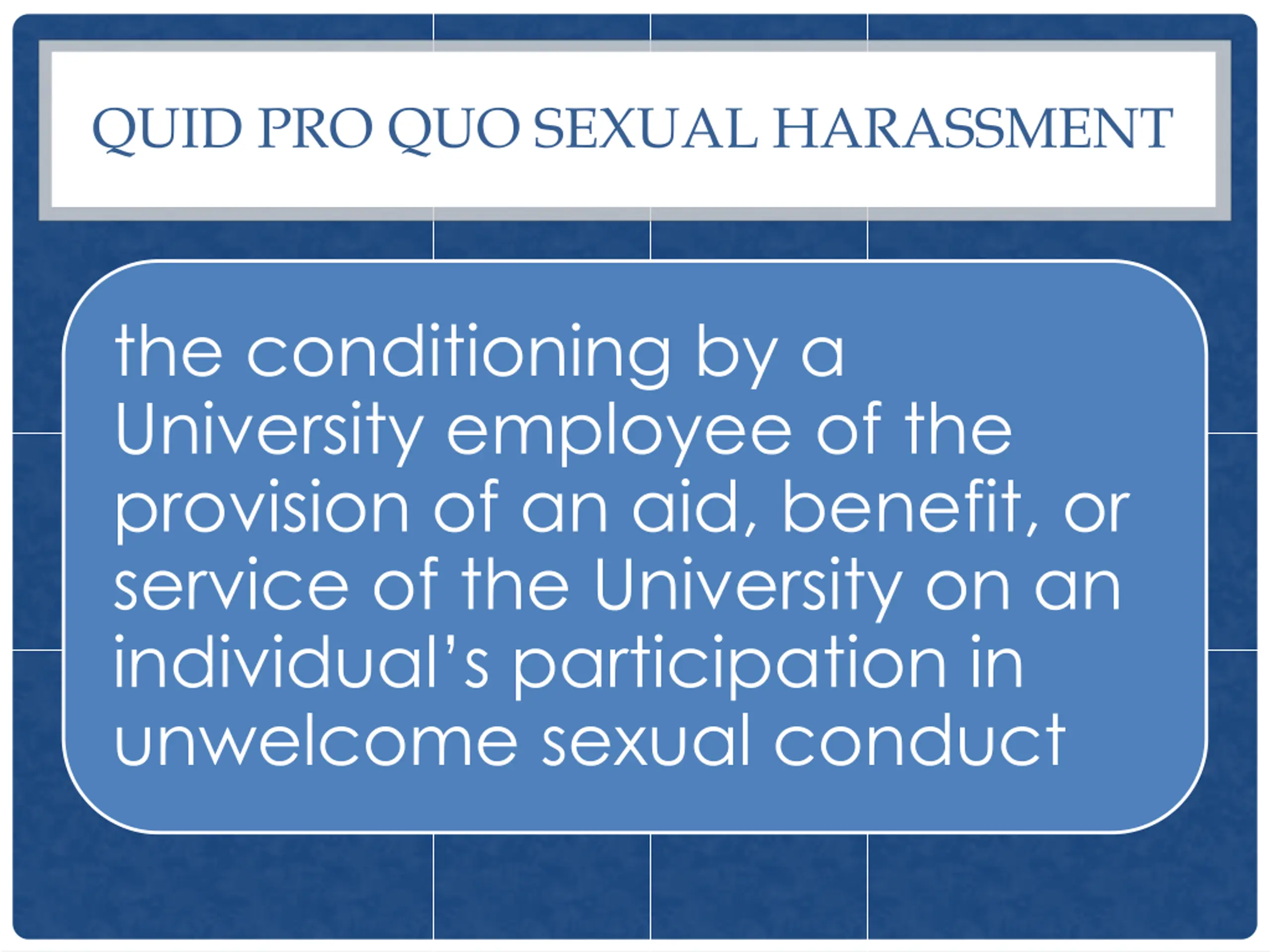 QUID PRO QUO SEXUAL HARASSMENT the conditioning by a University employee of the provision of an aid, benefit, or service of the University on an individual s participation in unwelcome sexual conduct