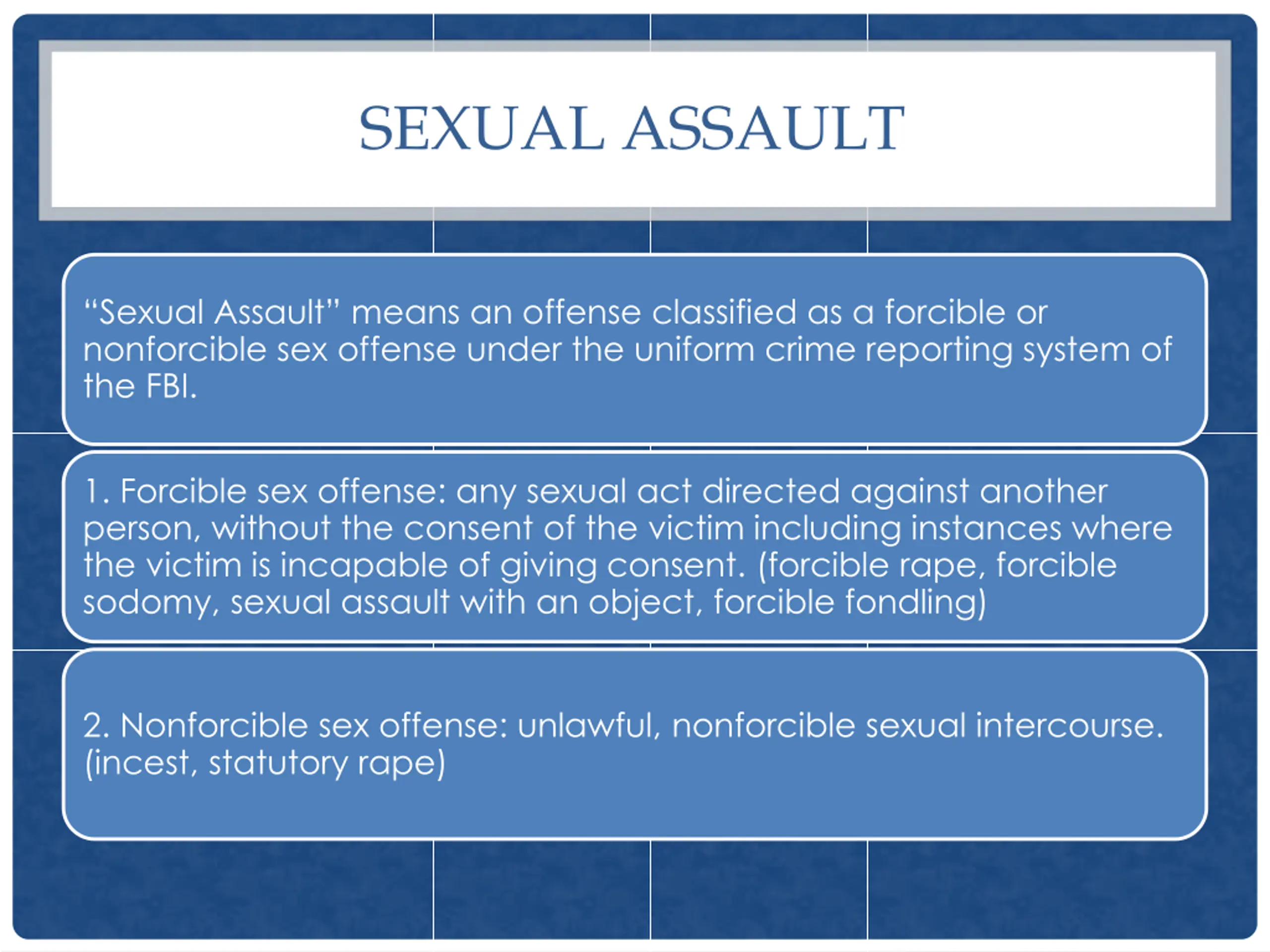 SEXUAL ASSAULT Sexual Assault means an offense classified as a forcible or nonforcible sex offense under the uniform crime reporting system of the FBI. 1. Forcible sex offense: any sexual act directed against another person, without the consent of the victim including instances where the victim is incapable of giving consent. (forcible rape, forcible sodomy, sexual assault with an object, forcible fondling) 2. Nonforcible sex offense: unlawful, nonforcible sexual intercourse. (incest, statutory rape)