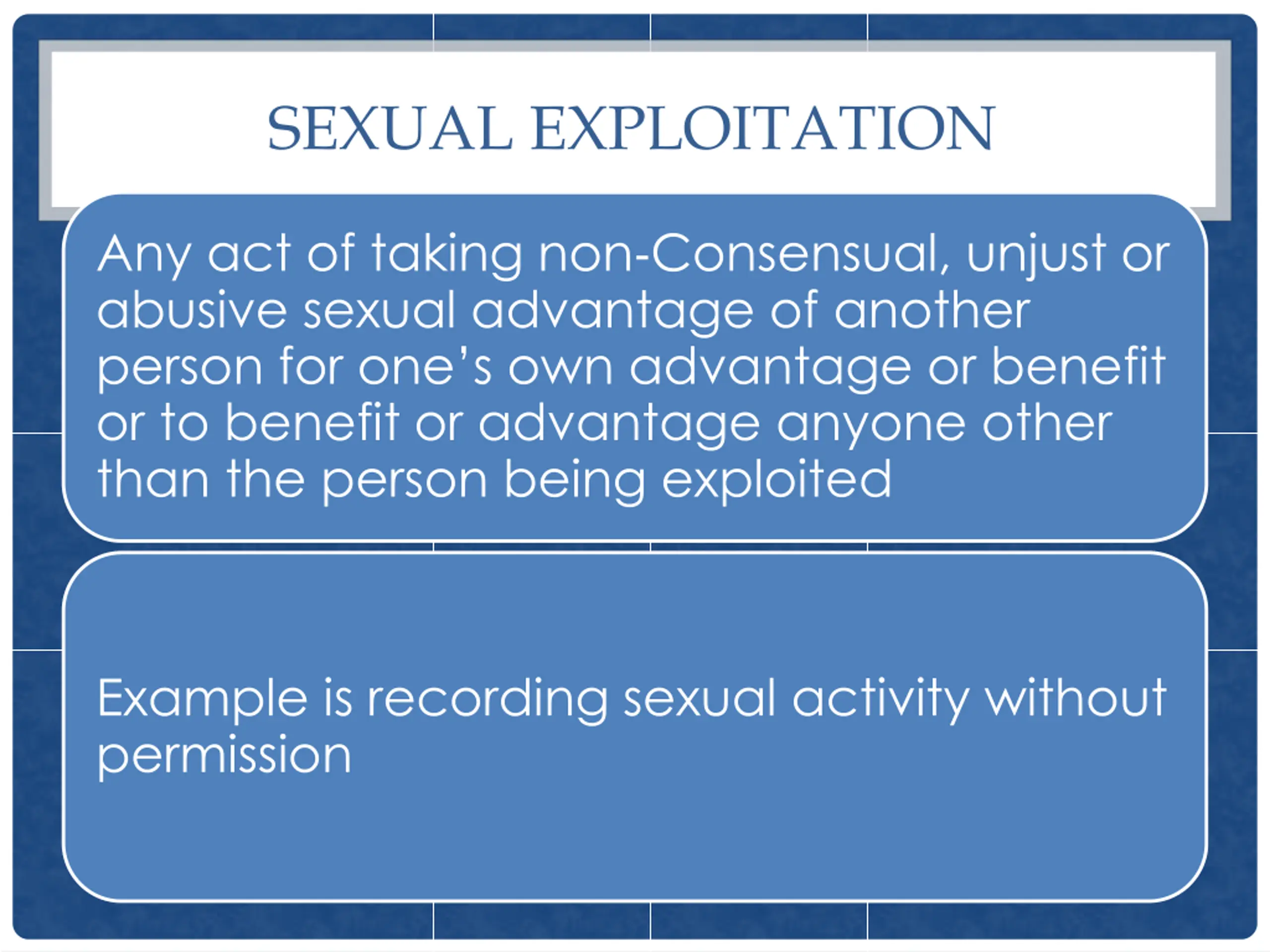 SEXUAL EXPLOITATION Any act of taking non Consensual, unjust or abusive sexual advantage of another person for one s own advantage or benefit or to benefit or advantage anyone other than the person being exploited Example is recording sexual activity without permission
