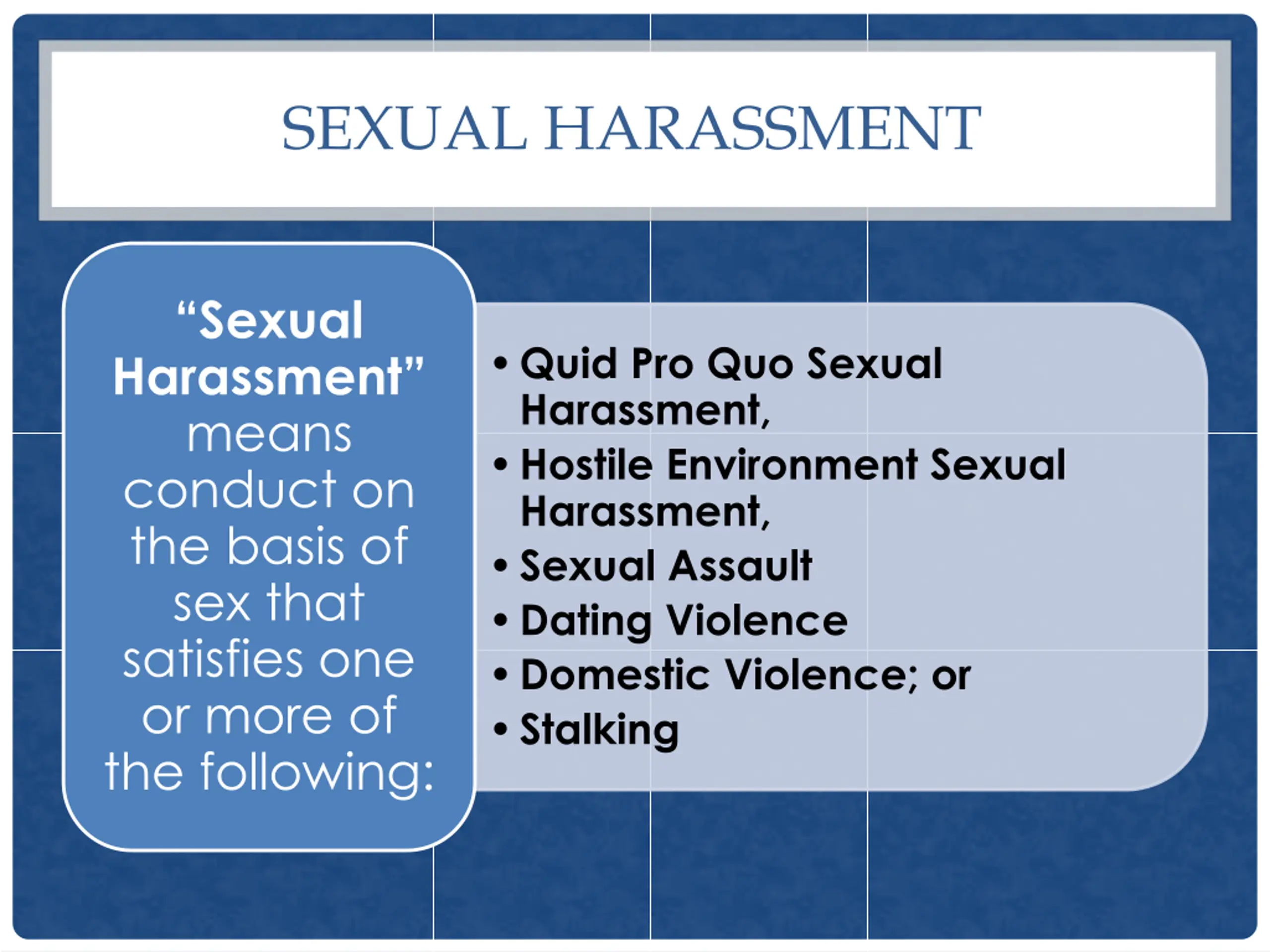 SEXUAL HARASSMENT Sexual Harassment means conduct on the basis of sex that satisfies one or more of the following: Quid Pro Quo Sexual Harassment, Hostile Environment Sexual Harassment, Sexual Assault Dating Violence Domestic Violence; or Stalking