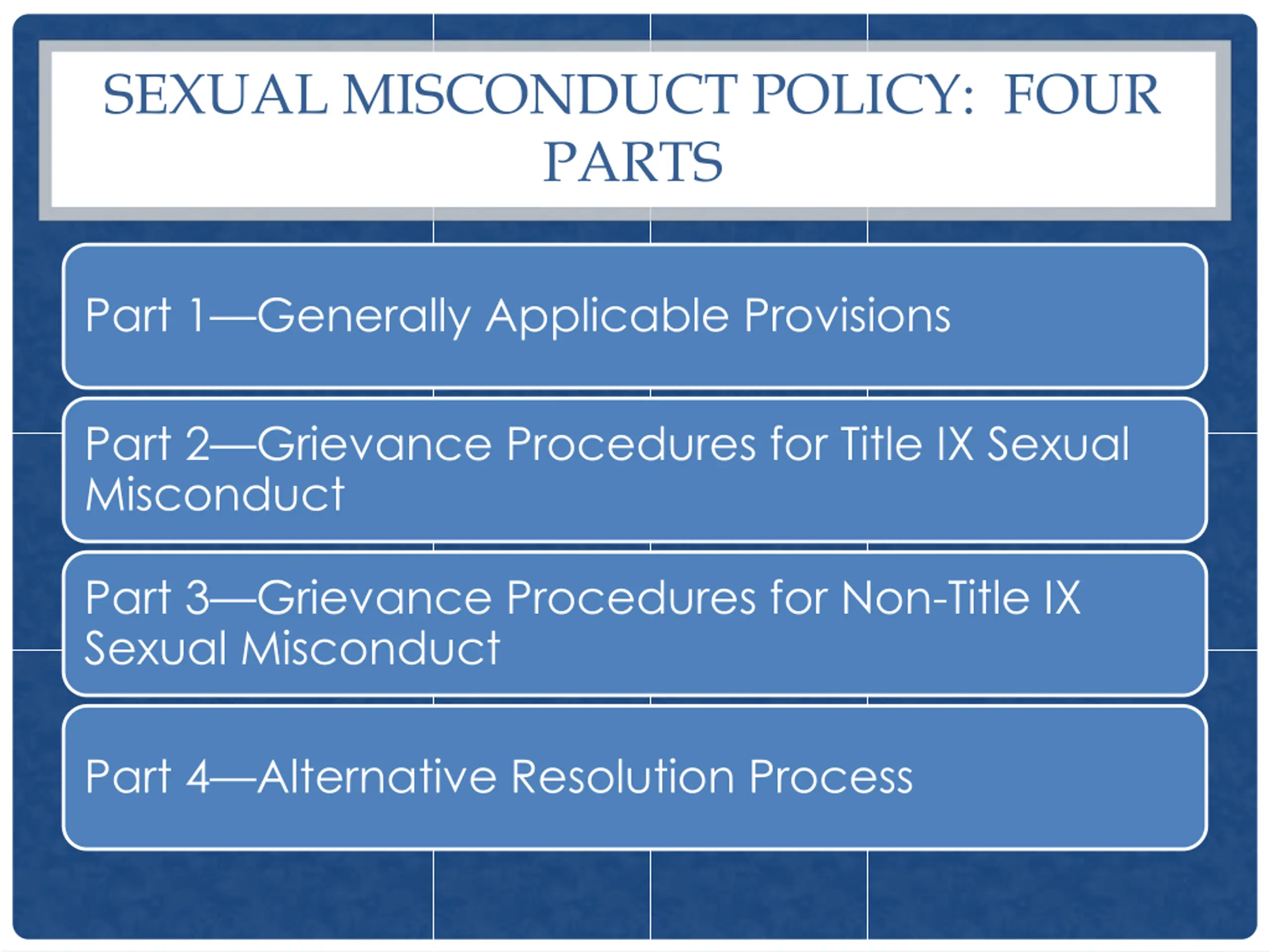 SEXUAL MISCONDUCT POLICY: FOUR PARTS Part 1 Generally Applicable Provisions Part 2 Grievance Procedures for Title IX Sexual Misconduct Part 3 Grievance Procedures for Non-Title IX Sexual Misconduct Part 4 Alternative Resolution Process