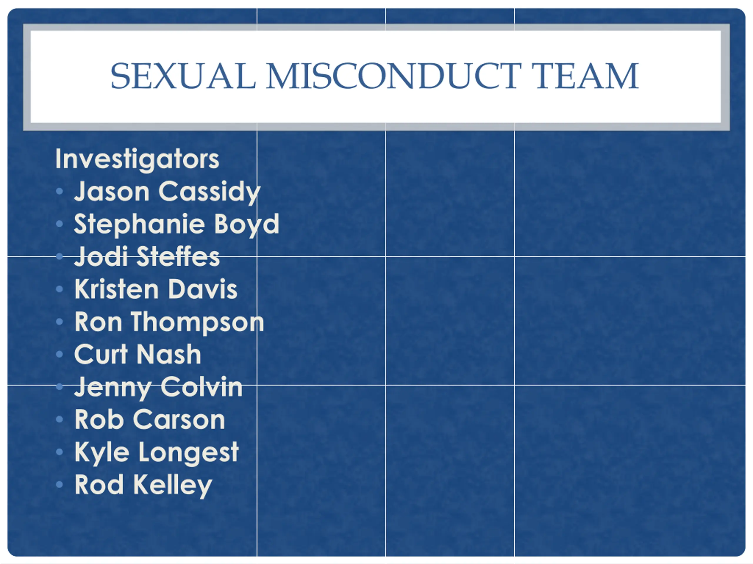 SEXUAL MISCONDUCT TEAM Investigators Jason Cassidy Stephanie Boyd Jodi Steffes Kristen Davis Ron Thompson Curt Nash Jenny Colvin Rob Carson Kyle Longest Rod Kelley