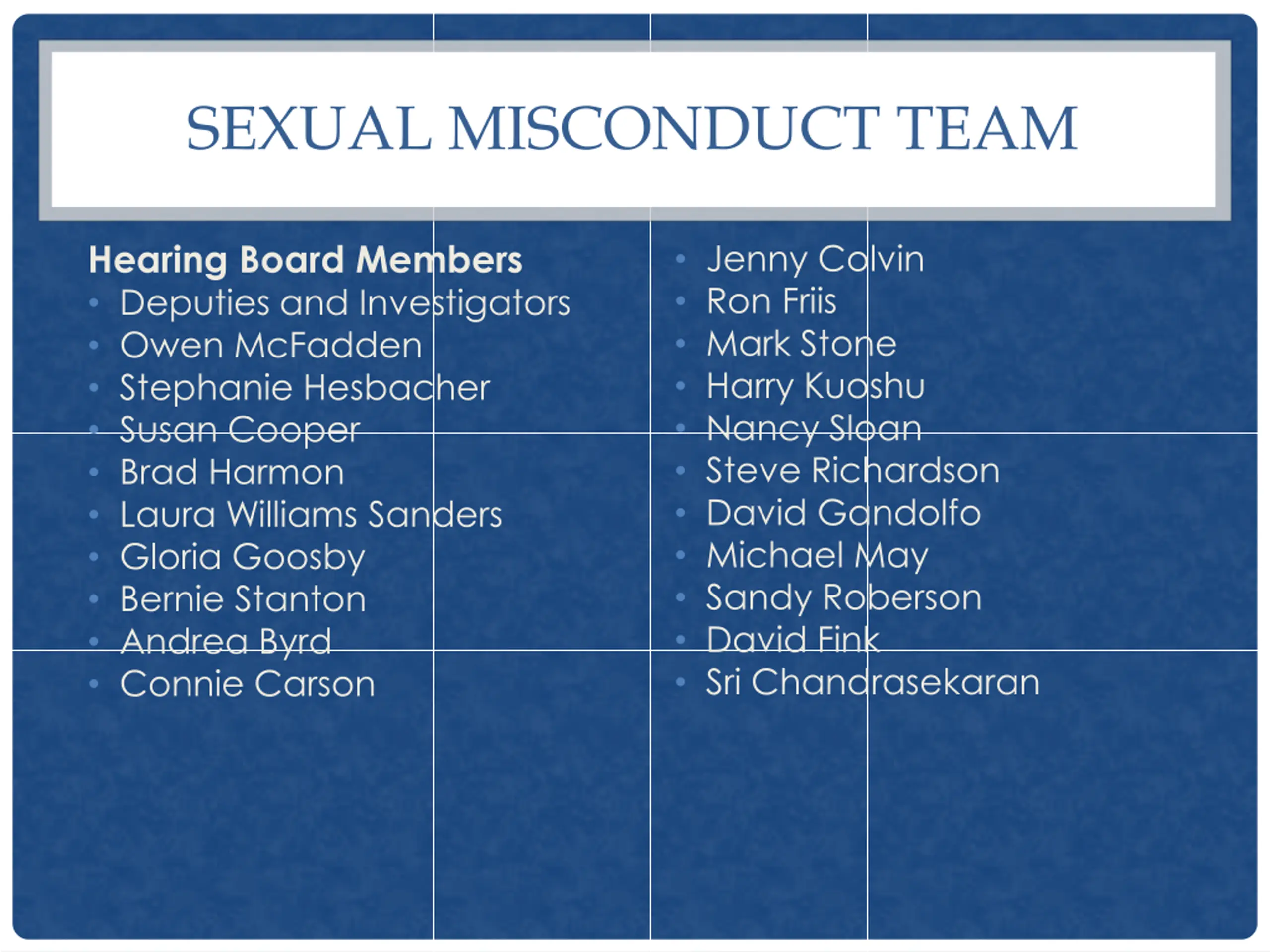 SEXUAL MISCONDUCT TEAM Hearing Board Members Deputies and Investigators Owen McFadden Stephanie Hesbacher Susan Cooper Brad Harmon Laura Williams Sanders Gloria Goosby Bernie Stanton Andrea Byrd Connie Carson Jenny Colvin Ron Friis Mark Stone Harry Kuoshu Nancy Sloan Steve Richardson David Gandolfo Michael May Sandy Roberson David Fink Sri Chandrasekaran