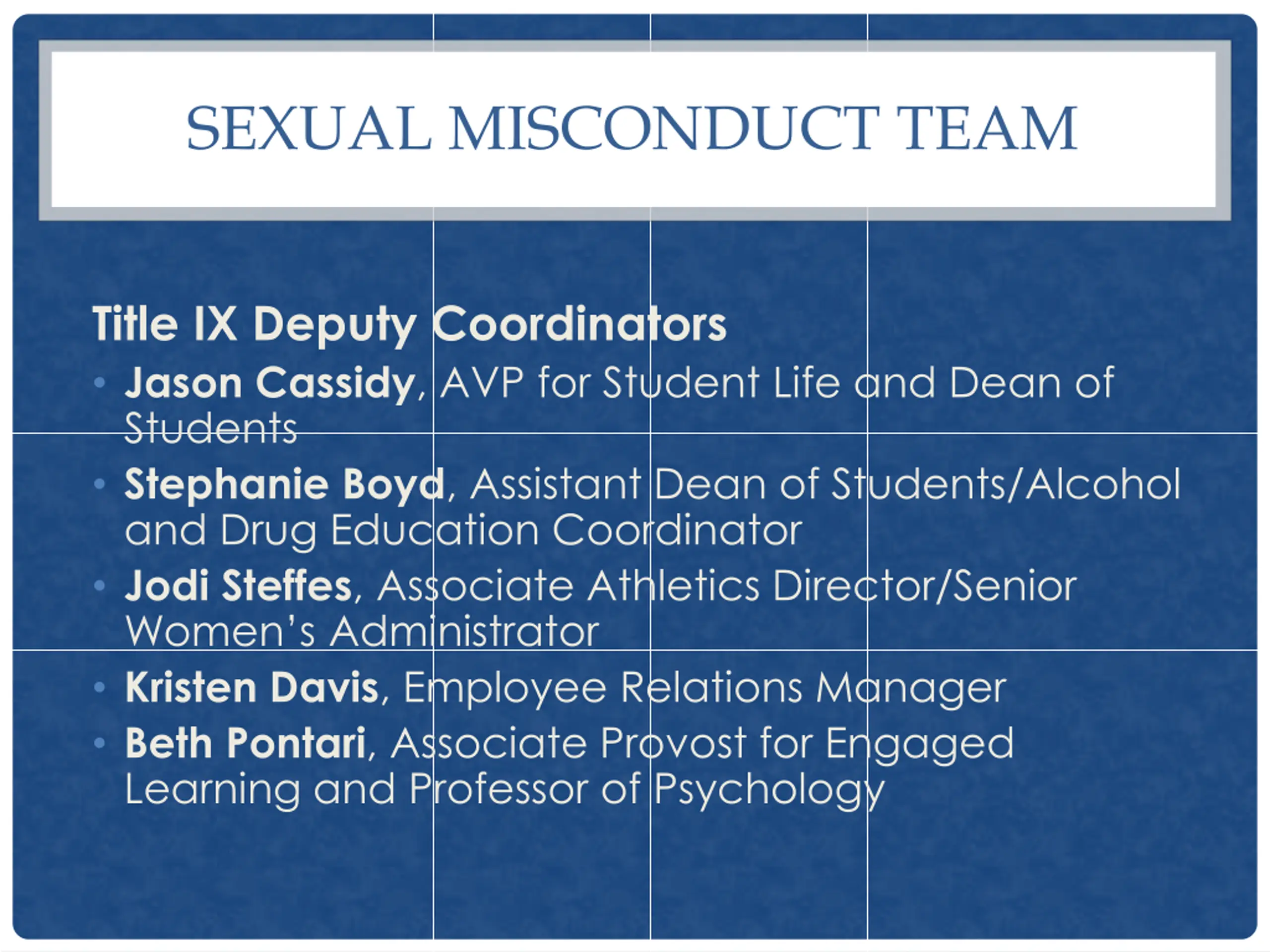 SEXUAL MISCONDUCT TEAM Title IX Deputy Coordinators Jason Cassidy, AVP for Student Life and Dean of Students Stephanie Boyd, Assistant Dean of Students/Alcohol and Drug Education Coordinator Jodi Steffes, Associate Athletics Director/Senior Women s Administrator Kristen Davis, Employee Relations Manager Beth Pontari, Associate Provost for Engaged Learning and Professor of Psychology