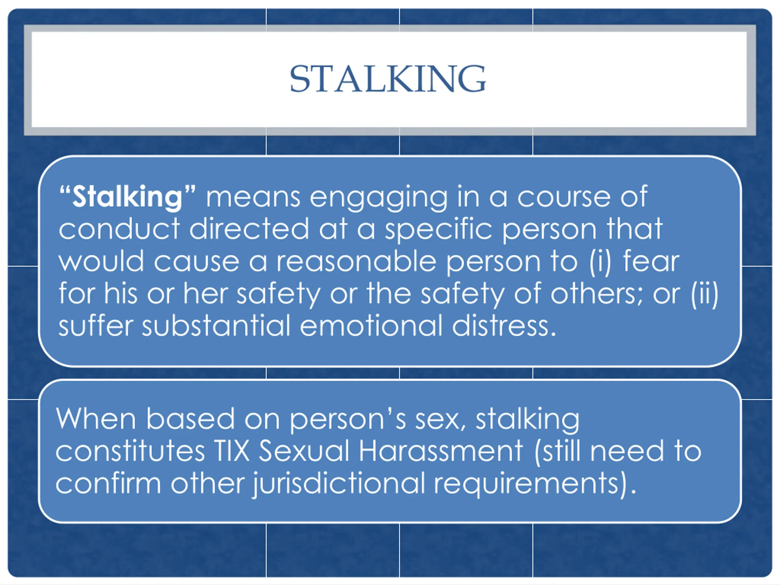 STALKING Stalking means engaging in a course of conduct directed at a specific person that would cause a reasonable person to (i) fear for his or her safety or the safety of others; or (ii) suffer substantial emotional distress. When based on person s sex, stalking constitutes TIX Sexual Harassment (still need to confirm other jurisdictional requirements).