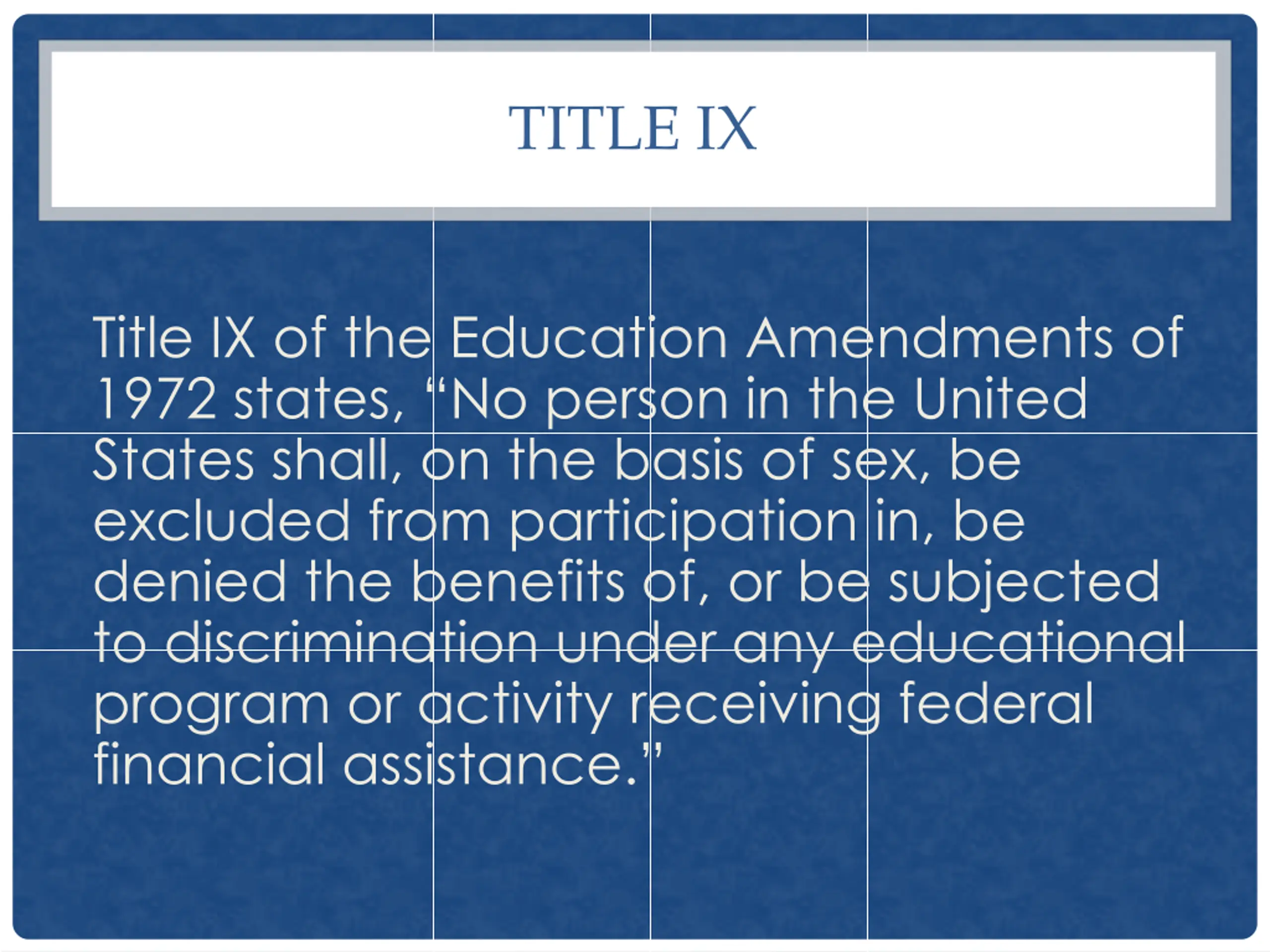 TITLE IX Title IX of the Education Amendments of 1972 states, No person in the United States shall, on the basis of sex, be excluded from participation in, be denied the benefits of, or be subjected to discrimination under any educational program or activity receiving federal financial assistance.