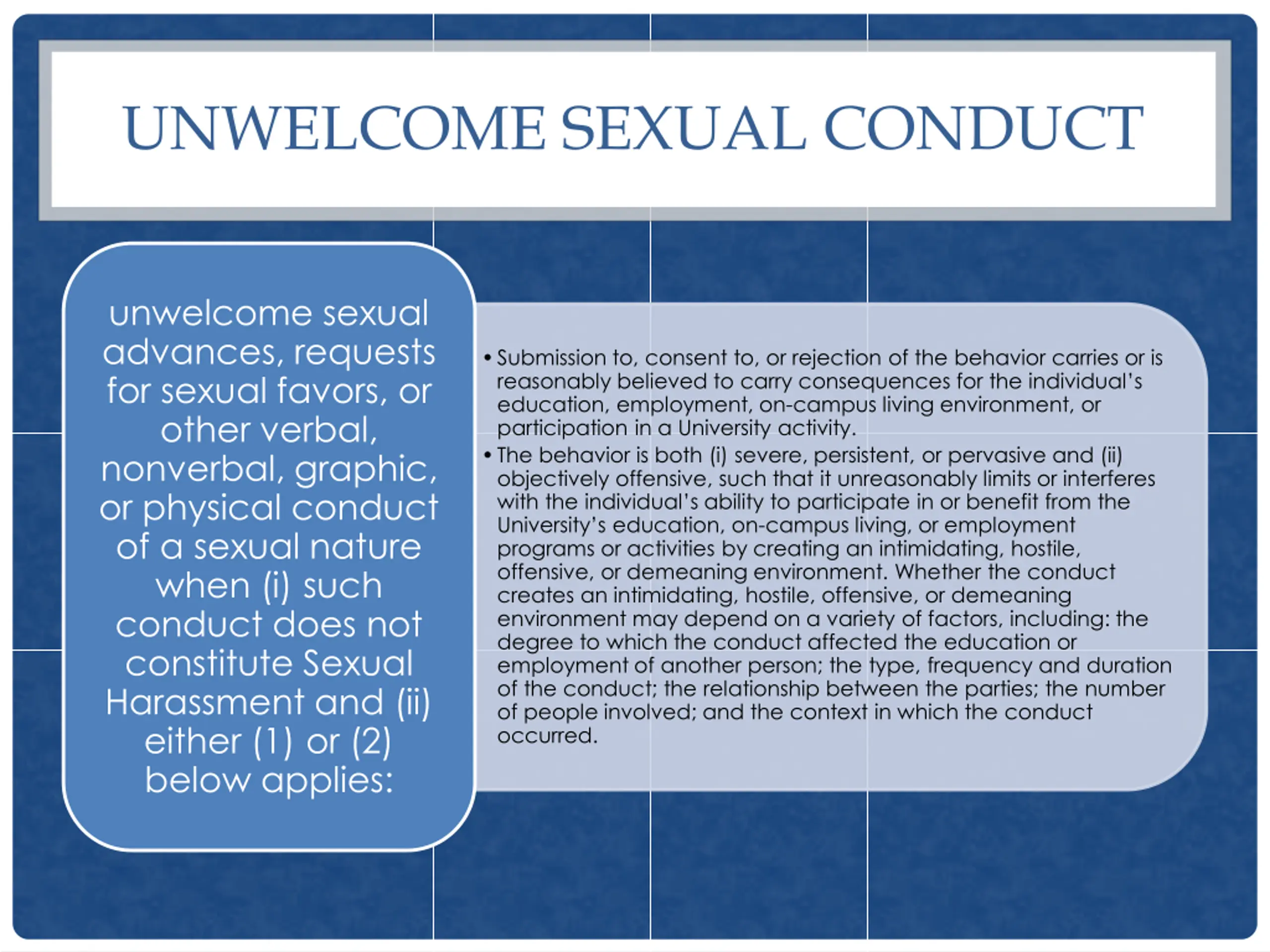 UNWELCOME SEXUAL CONDUCT unwelcome sexual advances, requests for sexual favors, or other verbal, nonverbal, graphic, or physical conduct of a sexual nature when (i) such conduct does not constitute Sexual Harassment and (ii) either (1) or (2) below applies: Submission to, consent to, or rejection of the behavior carries or is reasonably believed to carry consequences for the individual s education, employment, on-campus living environment, or participation in a University activity. The behavior is both (i) severe, persistent, or pervasive and (ii) objectively offensive, such that it unreasonably limits or interferes with the individual s ability to participate in or benefit from the University s education, on-campus living, or employment programs or activities by creating an intimidating, hostile, offensive, or demeaning environment. Whether the conduct creates an intimidating, hostile, offensive, or demeaning environment may depend on a variety of factors, including: the degree to which the conduct affected the education or employment of another person; the type, frequency and duration of the conduct; the relationship between the parties; the number of people involved; and the context in which the conduct occurred.