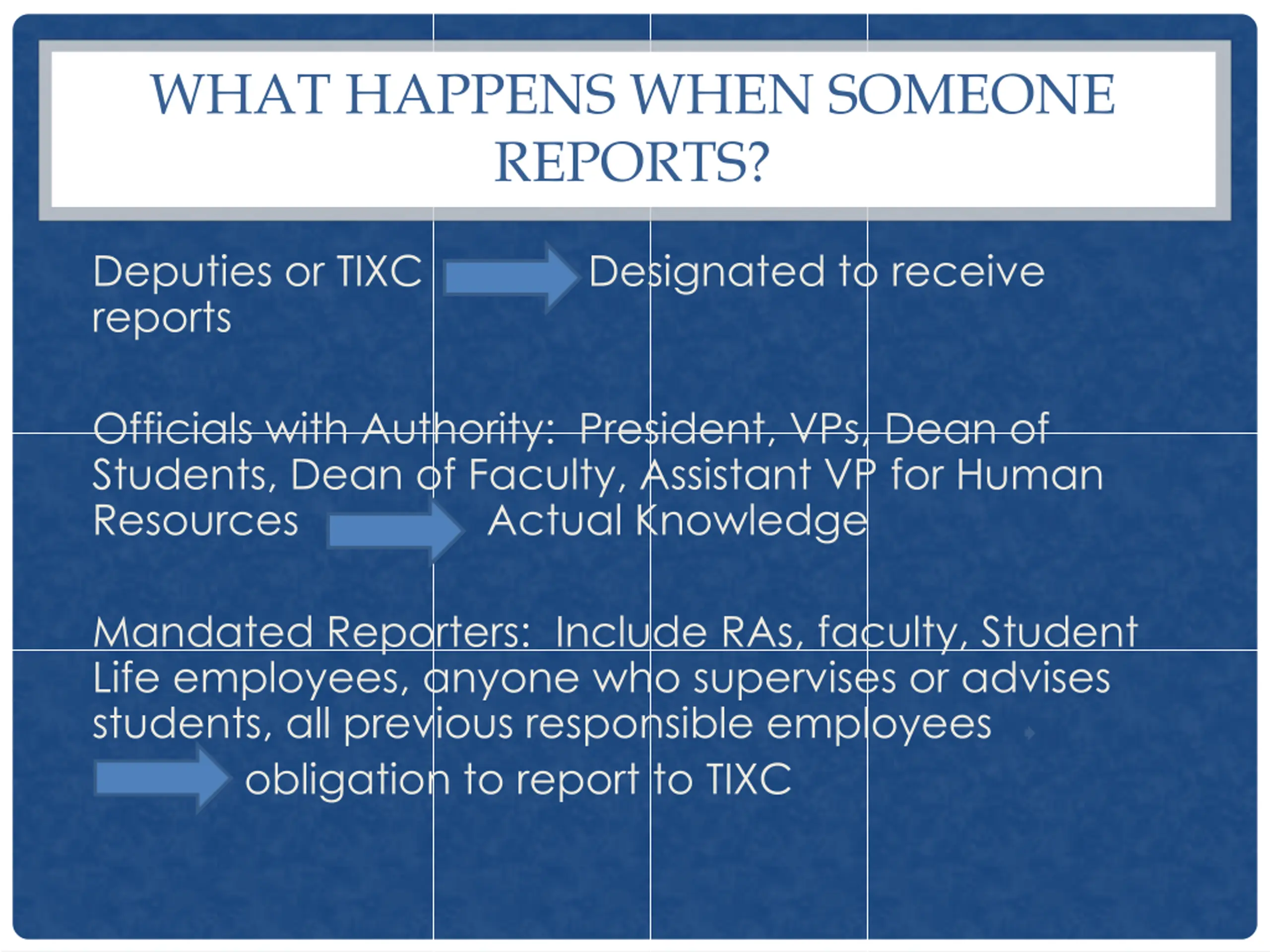 WHAT HAPPENS WHEN SOMEONE REPORTS? Deputies or TIXC Designated to receive reports Officials with Authority: President, VPs, Dean of Students, Dean of Faculty, Assistant VP for Human Resources Actual Knowledge Mandated Reporters: Include RAs, faculty, Student Life employees, anyone who supervises or advises students, all previous responsible employees obligation to report to TIXC