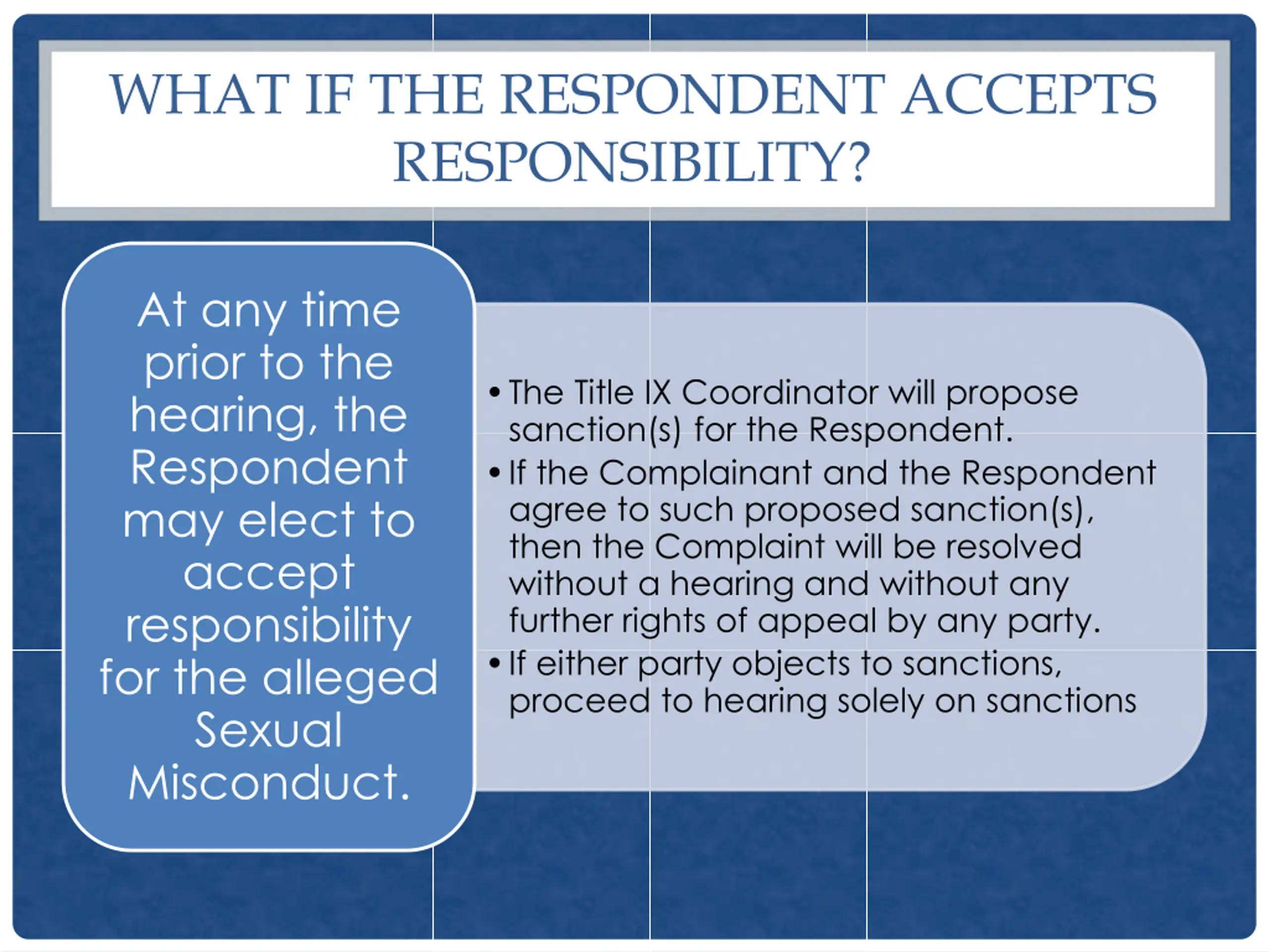 WHAT IF THE RESPONDENT ACCEPTS RESPONSIBILITY? At any time prior to the hearing, the Respondent may elect to accept responsibility for the alleged Sexual Misconduct. The Title IX Coordinator will propose sanction(s) for the Respondent. If the Complainant and the Respondent agree to such proposed sanction(s), then the Complaint will be resolved without a hearing and without any further rights of appeal by any party. If either party objects to sanctions, proceed to hearing solely on sanctions