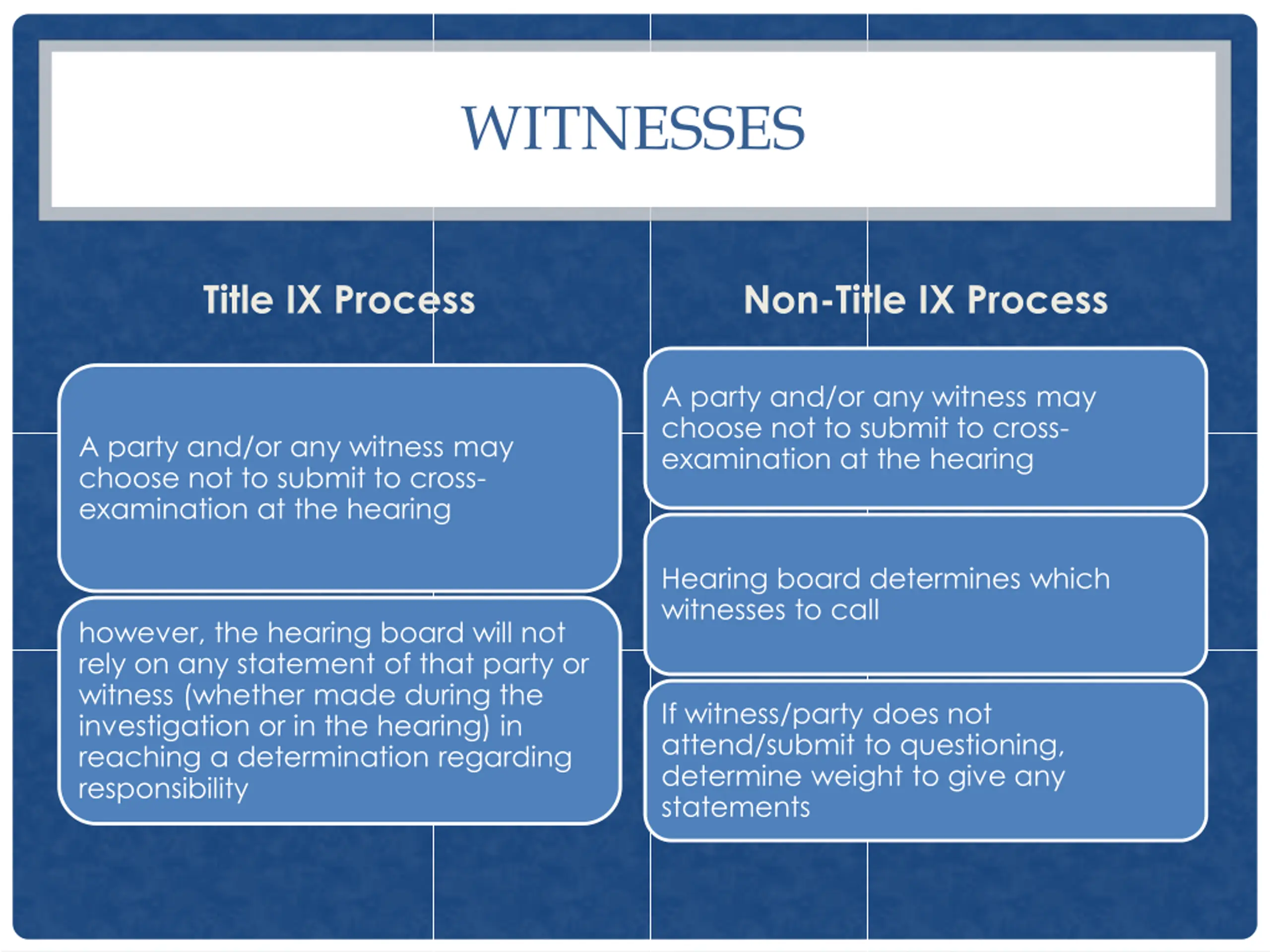 WITNESSES Title IX Process Non-Title IX Process A party and/or any witness may choose not to submit to cross- examination at the hearing A party and/or any witness may choose not to submit to cross- examination at the hearing Hearing board determines which witnesses to call however, the hearing board will not rely on any statement of that party or witness (whether made during the investigation or in the hearing) in reaching a determination regarding responsibility If witness/party does not attend/submit to questioning, determine weight to give any statements