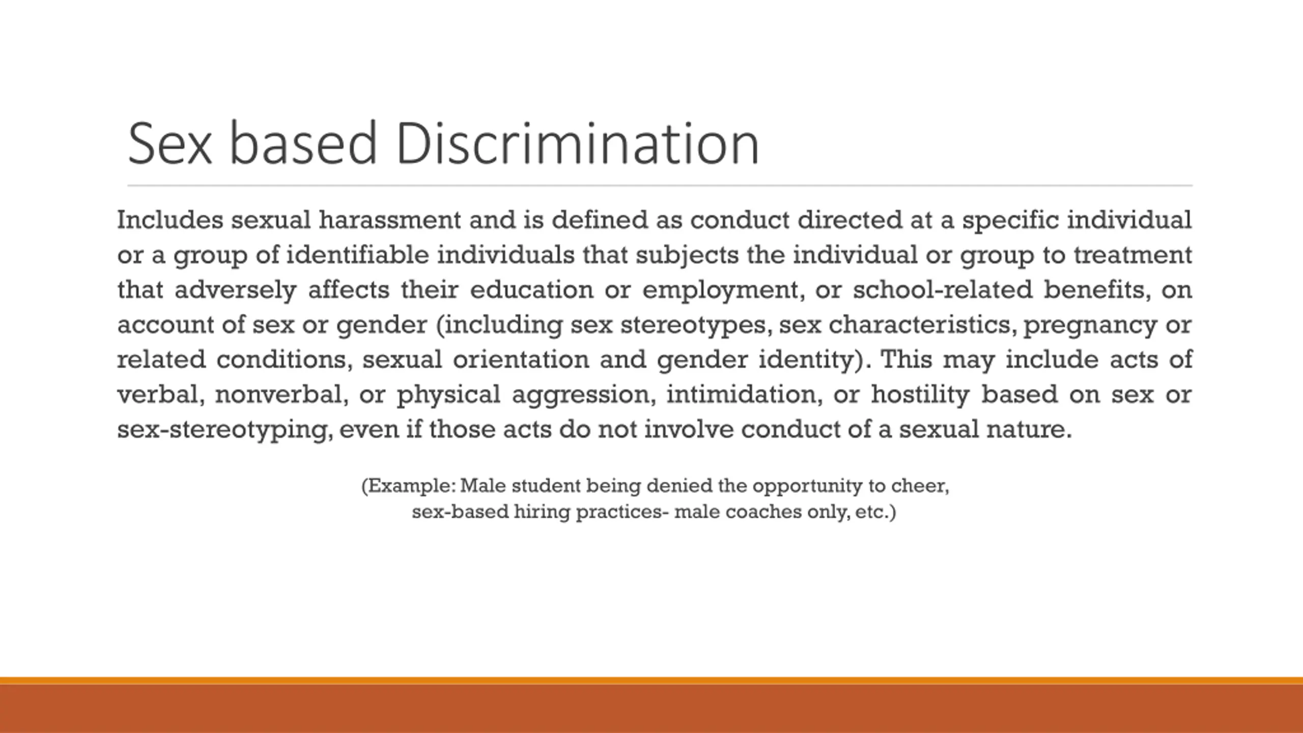 Sex based Discrimination Includes sexual harassment and is defined as conduct directed at a specific individual or a group of identifiable individuals that subjects the individual or group to treatment that adversely affects their education or employment, or school-related benefits, on account of sex or gender (including sex stereotypes, sex characteristics, pregnancy or related conditions, sexual orientation and gender identity). This may include acts of verbal, nonverbal, or physical aggression, intimidation, or hostility based on sex or sex-stereotyping, even if those acts do not involve conduct of a sexual nature. (Example: Male student being denied the opportunity to cheer, sex-based hiring practices- male coaches only, etc.)
