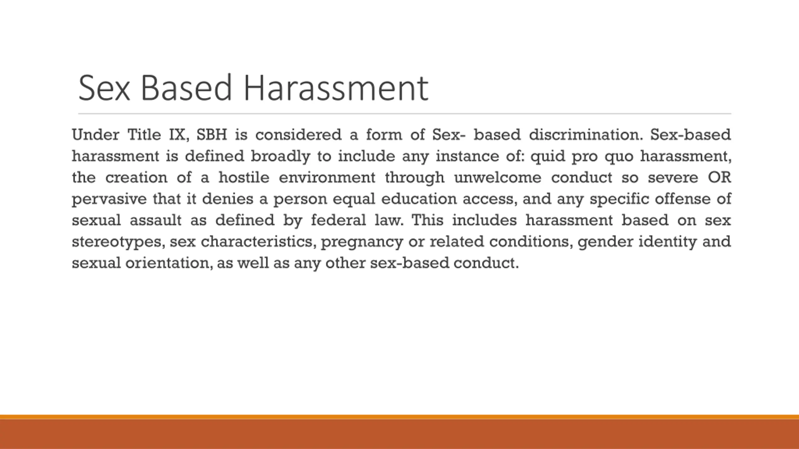 Sex Based Harassment Under Title IX, SBH is considered a form of Sex- based discrimination. Sex-based harassment is defined broadly to include any instance of: quid pro quo harassment, the creation of a hostile environment through unwelcome conduct so severe OR pervasive that it denies a person equal education access, and any specific offense of sexual assault as defined by federal law. This includes harassment based on sex stereotypes, sex characteristics, pregnancy or related conditions, gender identity and sexual orientation, as well as any other sex-based conduct.