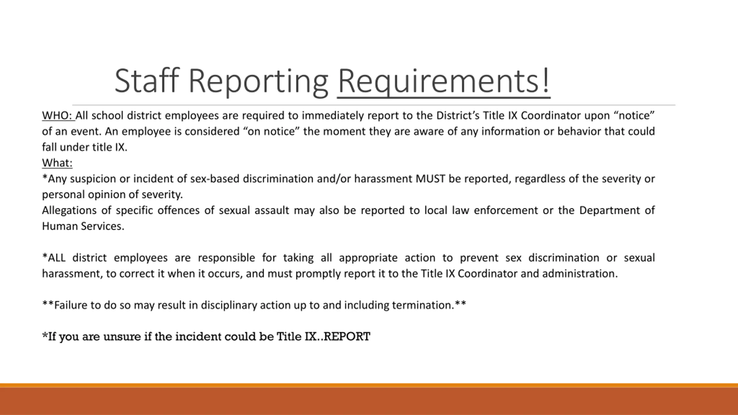 Staff Reporting Requirements! WHO: All school district employees are required to immediately report to the District s Title IX Coordinator upon notice of an event. An employee is considered onnotice the moment they are aware of any information or behavior that could fall under title IX. What: *Any suspicion or incident of sex-based discrimination and/or harassment MUST be reported, regardless of the severity or personal opinion of severity. Allegations of specific offences of sexual assault may also be reported to local law enforcement or the Department of Human Services. *ALL district employees are responsible for taking all appropriate action to prevent sex discrimination or sexual harassment, to correct it when it occurs, and must promptly report it to the Title IX Coordinator and administration. **Failure to do so may result in disciplinary action up to and including termination.** *If you are unsure if the incident could be Title IX..REPORT