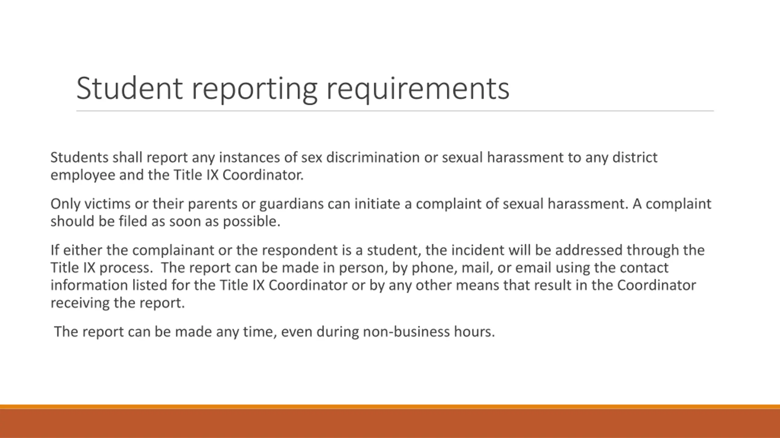 Student reporting requirements Students shall report any instances of sex discrimination or sexual harassment to any district employee and the Title IX Coordinator. Only victims or their parents or guardians can initiate a complaint of sexual harassment. A complaint should be filed as soon as possible. If either the complainant or the respondent is a student, the incident will be addressed through the Title IX process. The report can be made in person, by phone, mail, or email using the contact information listed for the Title IX Coordinator or by any other means that result in the Coordinator receiving the report. The report can be made any time, even during non-business hours.
