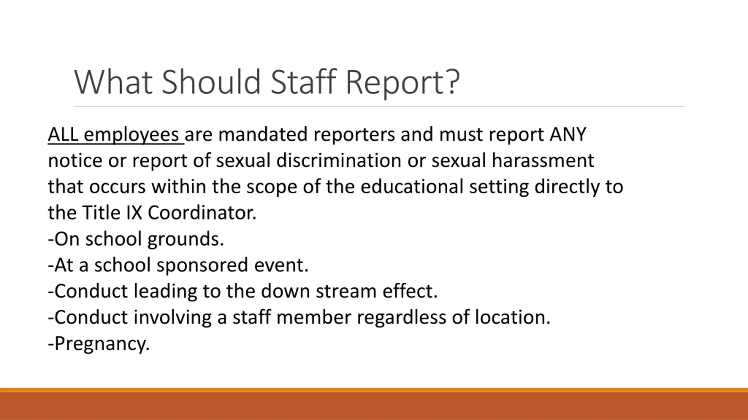 What Should Staff Report? ALL employees are mandated reporters and must report ANY notice or report of sexual discrimination or sexual harassment that occurs within the scope of the educational setting directly to the Title IX Coordinator. -On school grounds. -At a school sponsored event. -Conduct leading to the down stream effect. -Conduct involving a staff member regardless of location. -Pregnancy.