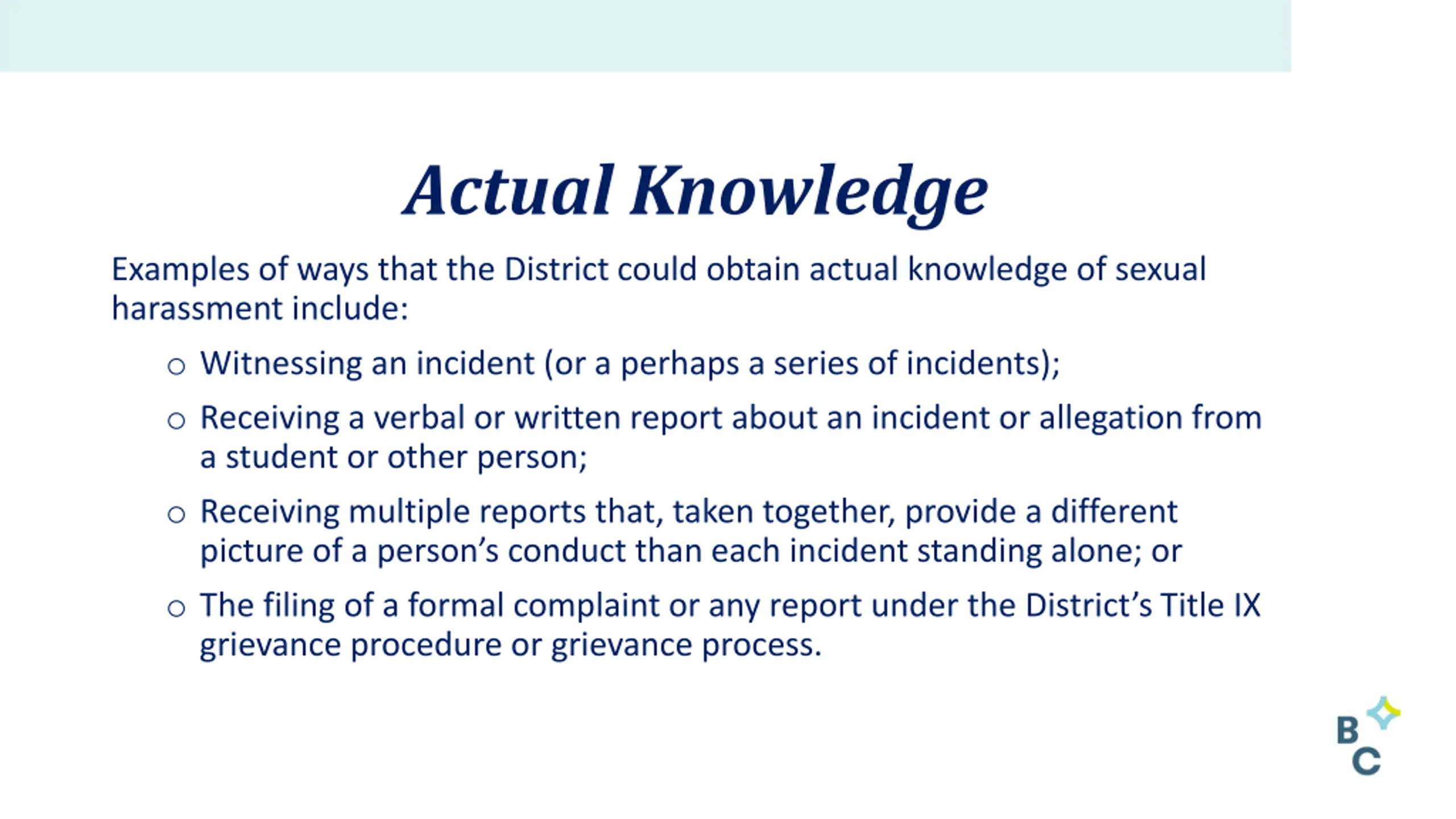 Actual Knowledge Examples of ways that the District could obtain actual knowledge of sexual harassment include: o Witnessing an incident (or a perhaps a series of incidents); o Receiving a verbal or written report about an incident or allegation from a student or other person; o Receiving multiple reports that, taken together, provide a different picture of a person s conduct than each incident standing alone; or o The filing of a formal complaint or any report under the District s Title IX grievance procedure or grievance process.