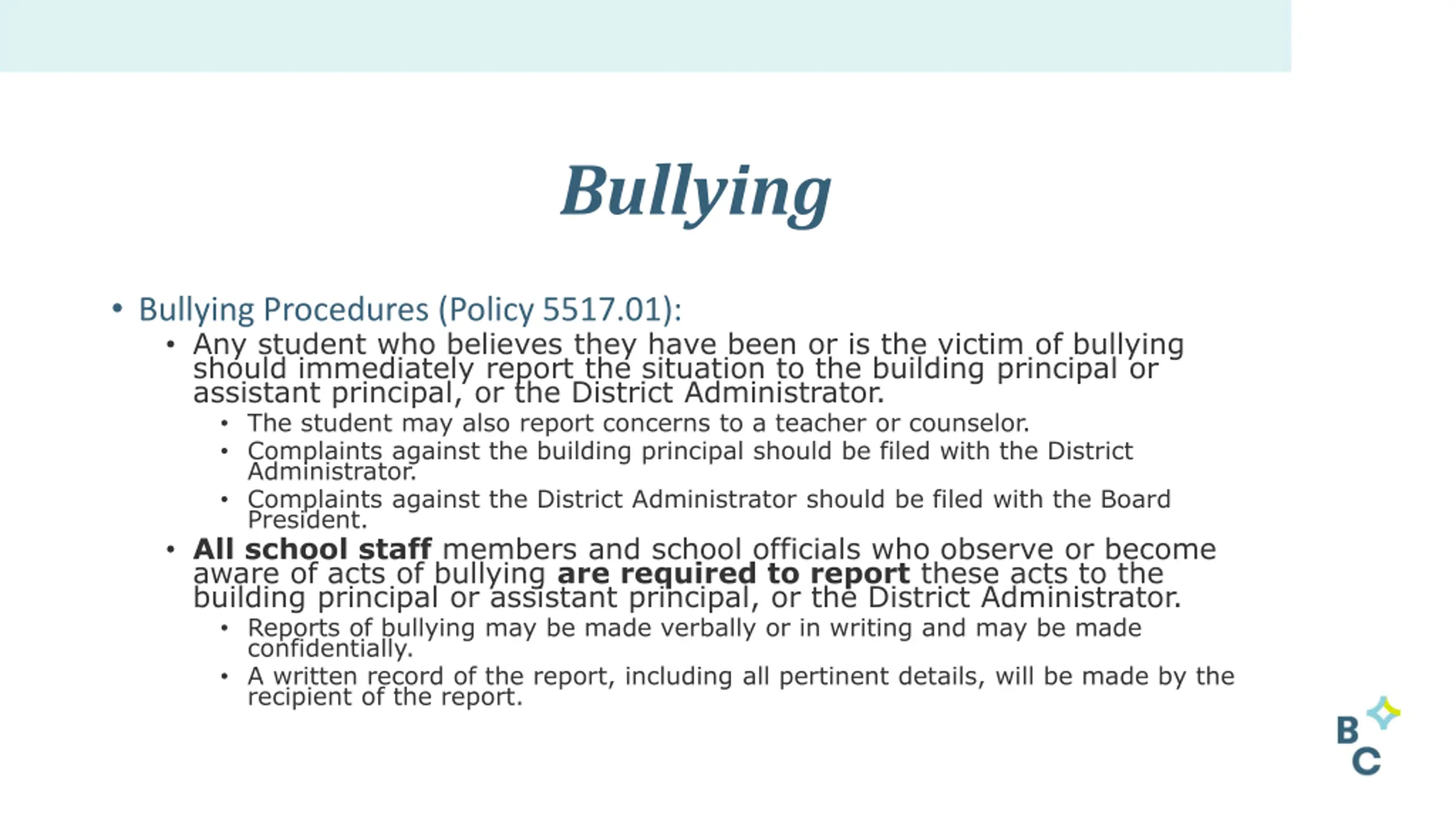 Bullying Bullying Procedures (Policy 5517.01): Any student who believes they have been or is the victim of bullying should immediately report the situation to the building principal or assistant principal, or the District Administrator. The student may also report concerns to a teacher or counselor. Complaints against the building principal should be filed with the District Administrator. Complaints against the District Administrator should be filed with the Board President. All school staff members and school officials who observe or become aware of acts of bullying are required to report these acts to the building principal or assistant principal, or the District Administrator. Reports of bullying may be made verbally or in writing and may be made confidentially. A written record of the report, including all pertinent details, will be made by the recipient of the report.