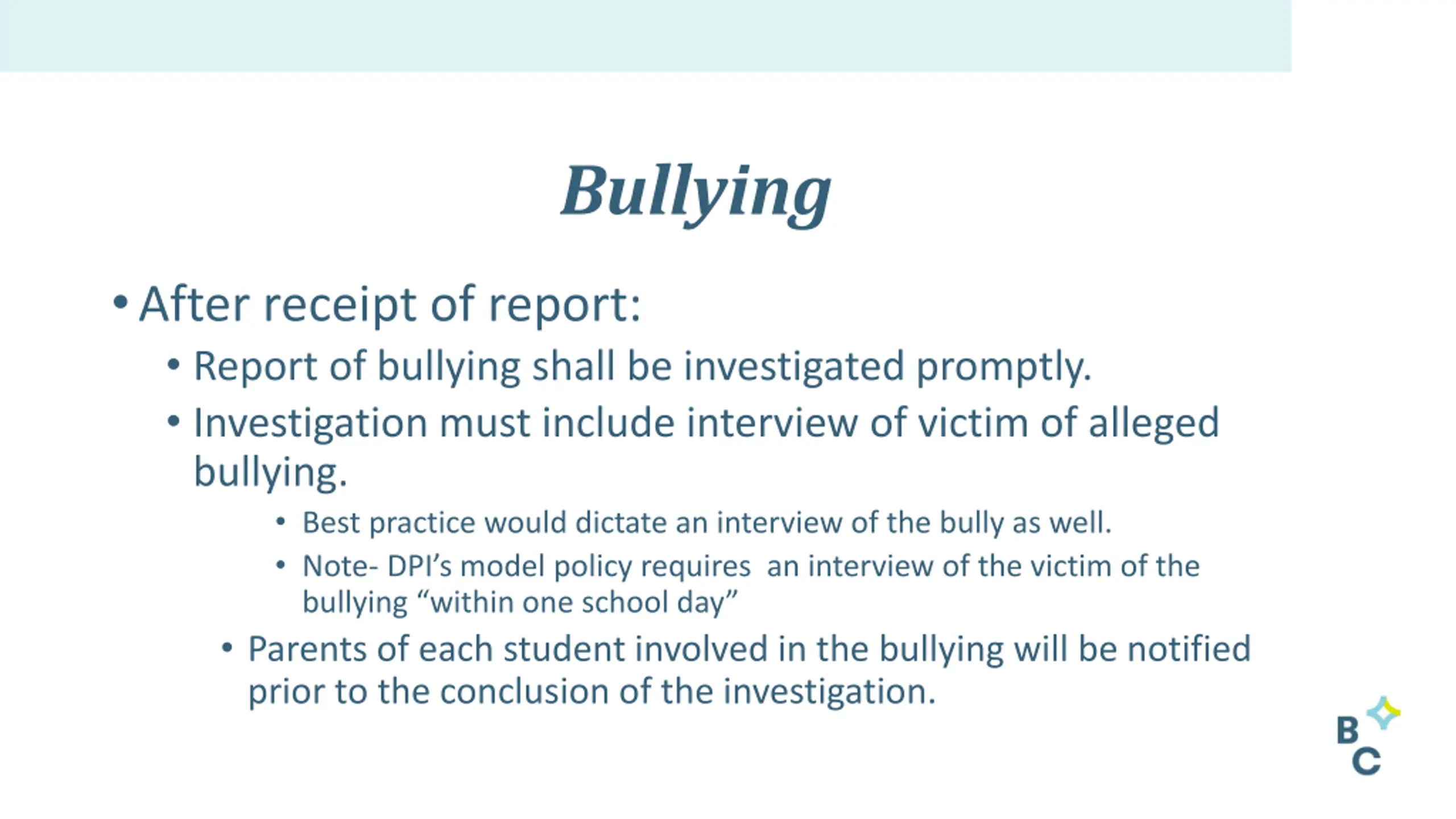 Bullying After receipt of report: Report of bullying shall be investigated promptly. Investigation must include interview of victim of alleged bullying. Best practice would dictate an interview of the bully as well. Note- DPI s model policy requires an interview of the victim of the bullying within one school day Parents of each student involved in the bullying will be notified prior to the conclusion of the investigation.