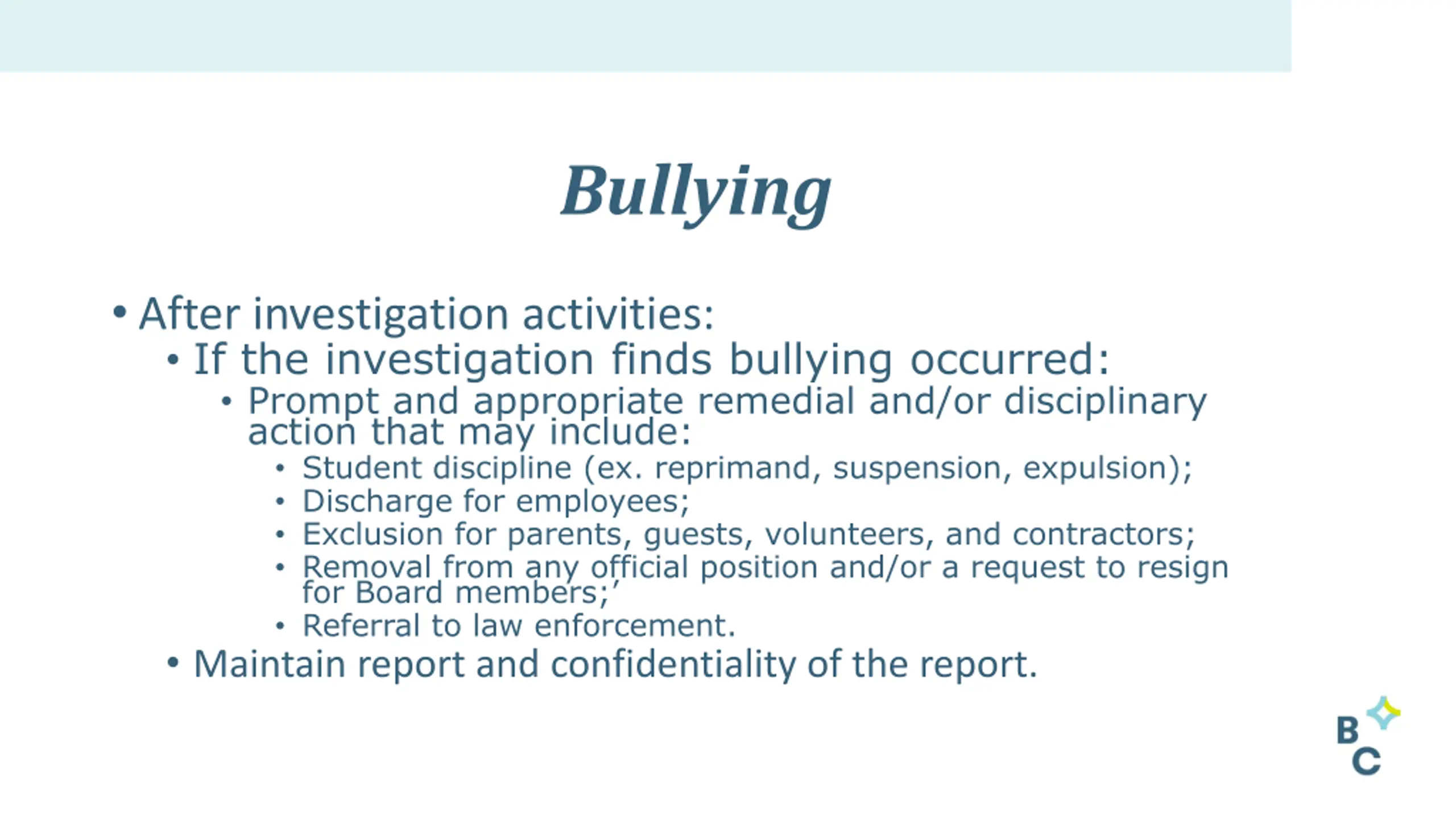 Bullying After investigation activities: If the investigation finds bullying occurred: Prompt and appropriate remedial and/or disciplinary action that may include: Student discipline (ex. reprimand, suspension, expulsion); Discharge for employees; Exclusion for parents, guests, volunteers, and contractors; Removal from any official position and/or a request to resign for Board members; Referral to law enforcement. Maintain report and confidentiality of the report.
