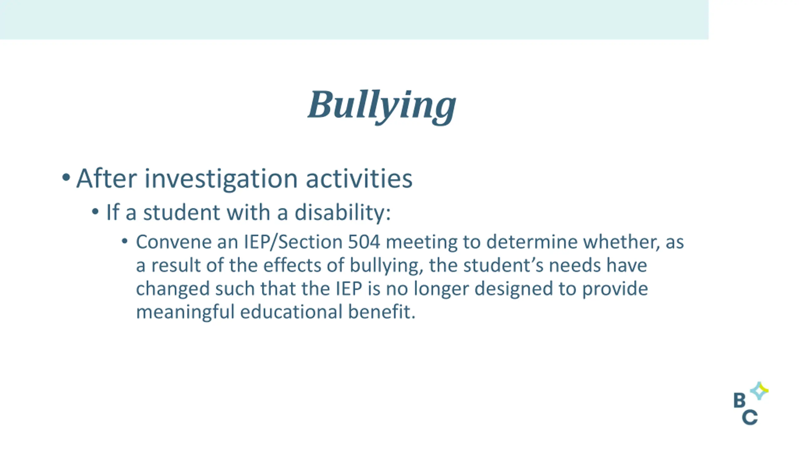 Bullying After investigation activities If a student with a disability: Convene an IEP/Section 504 meeting to determine whether, as a result of the effects of bullying, the student s needs have changed such that the IEP is no longer designed to provide meaningful educational benefit.