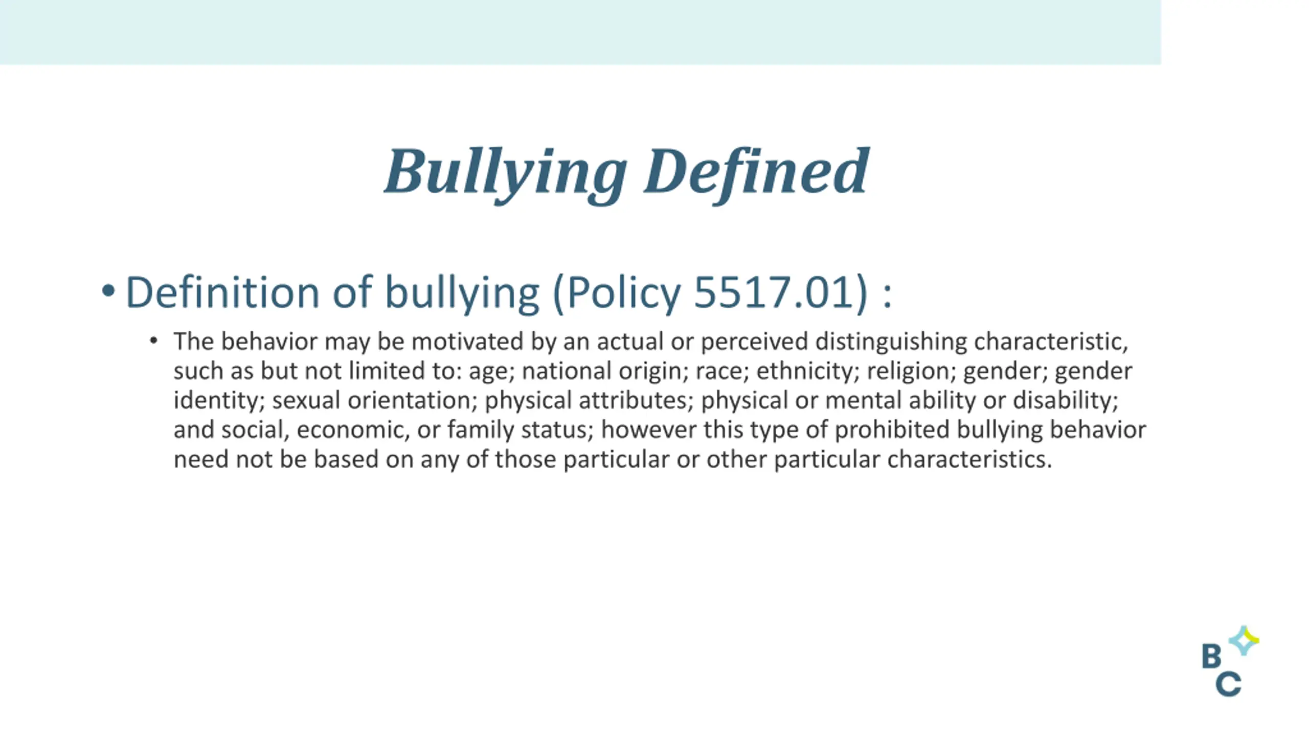 Bullying Defined Definition of bullying (Policy 5517.01) : The behavior may be motivated by an actual or perceived distinguishing characteristic, such as but not limited to: age; national origin; race; ethnicity; religion; gender; gender identity; sexual orientation; physical attributes; physical or mental ability or disability; and social, economic, or family status; however this type of prohibited bullying behavior need not be based on any of those particular or other particular characteristics.