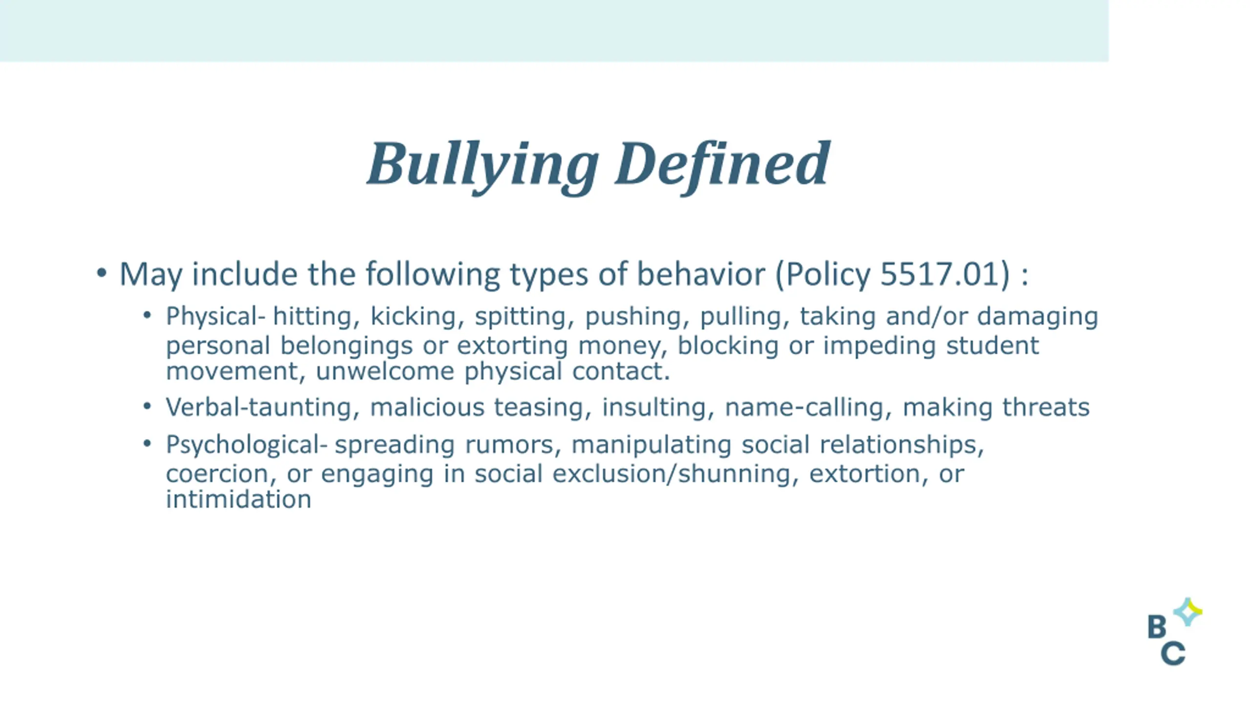 Bullying Defined May include the following types of behavior (Policy 5517.01) : Physical- hitting, kicking, spitting, pushing, pulling, taking and/or damaging personal belongings or extorting money, blocking or impeding student movement, unwelcome physical contact. Verbal-taunting, malicious teasing, insulting, name-calling, making threats Psychological- spreading rumors, manipulating social relationships, coercion, or engaging in social exclusion/shunning, extortion, or intimidation
