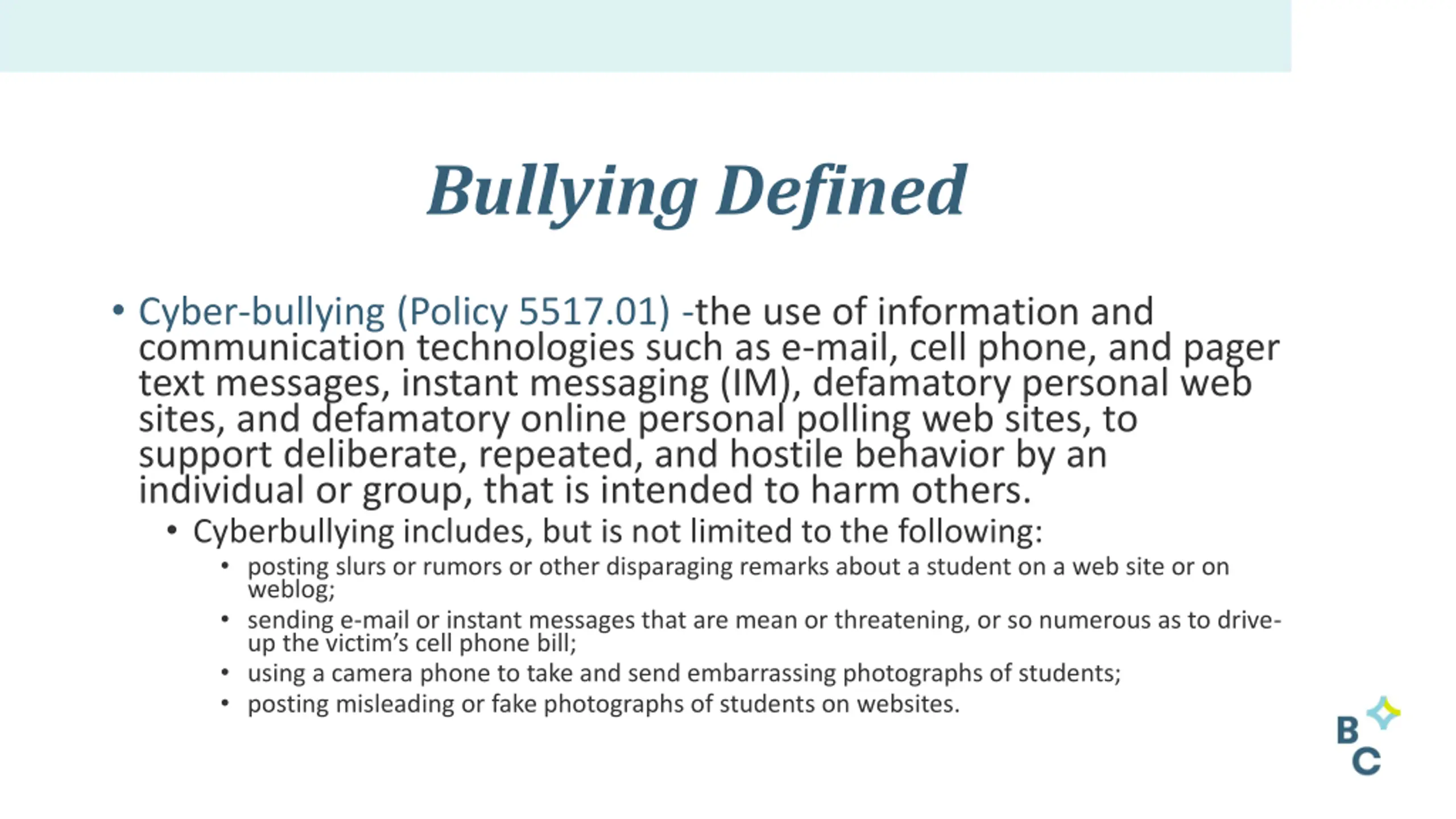 Bullying Defined Cyber-bullying (Policy 5517.01) -the use of information and communication technologies such as e-mail, cell phone, and pager text messages, instant messaging (IM), defamatory personal web sites, and defamatory online personal polling web sites, to support deliberate, repeated, and hostile behavior by an individual or group, that is intended to harm others. Cyberbullying includes, but is not limited to the following: posting slurs or rumors or other disparaging remarks about a student on a web site or on weblog; sending e-mail or instant messages that are mean or threatening, or so numerous as to drive- up the victim s cell phone bill; using a camera phone to take and send embarrassing photographs of students; posting misleading or fake photographs of students on websites.