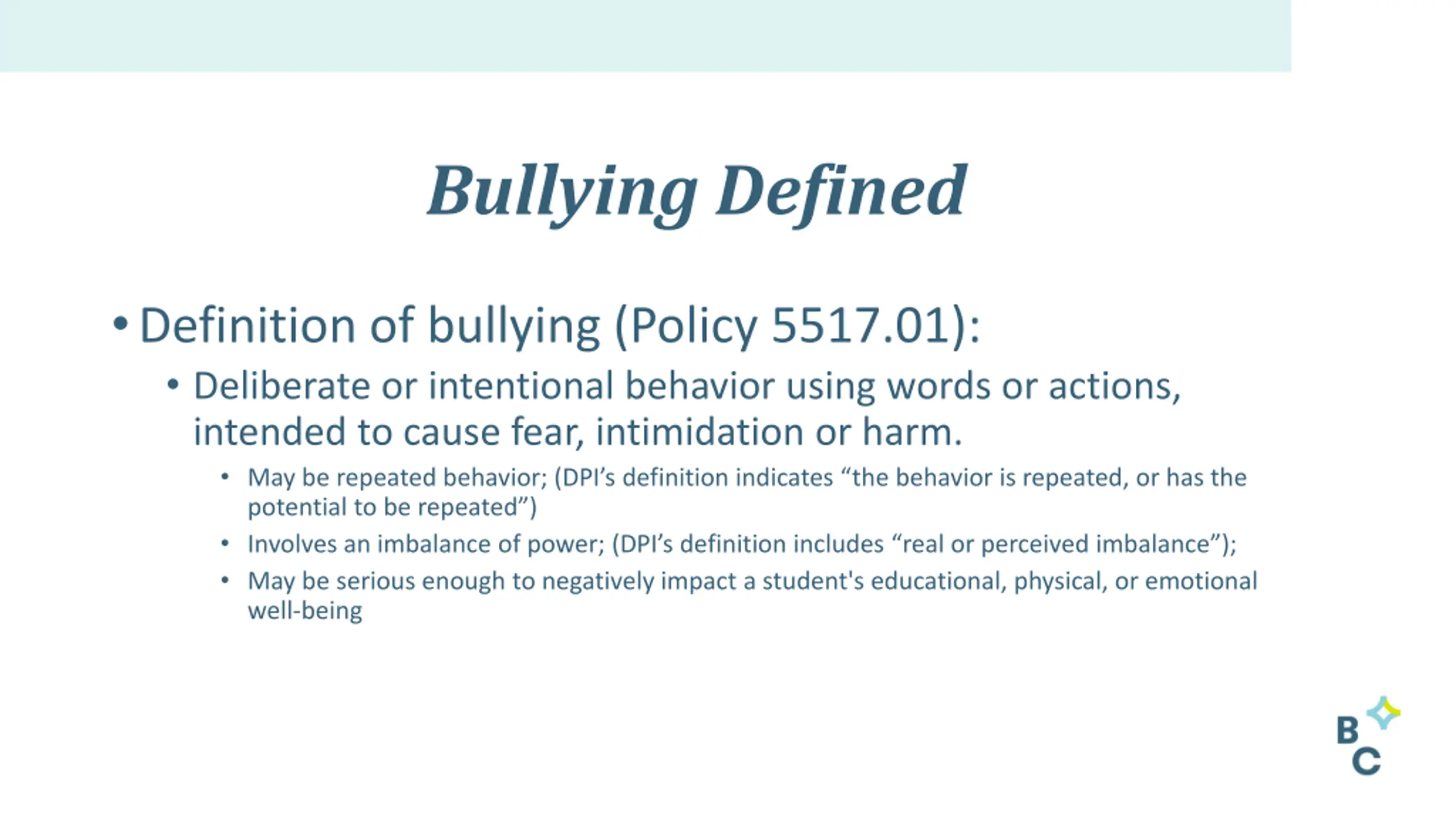 Bullying Defined Definition of bullying (Policy 5517.01): Deliberate or intentional behavior using words or actions, intended to cause fear, intimidation or harm. May be repeated behavior; (DPI s definition indicates the behavior is repeated, or has the potential to be repeated ) Involves an imbalance of power; (DPI s definition includes real or perceived imbalance ); May be serious enough to negatively impact a student's educational, physical, or emotional well-being