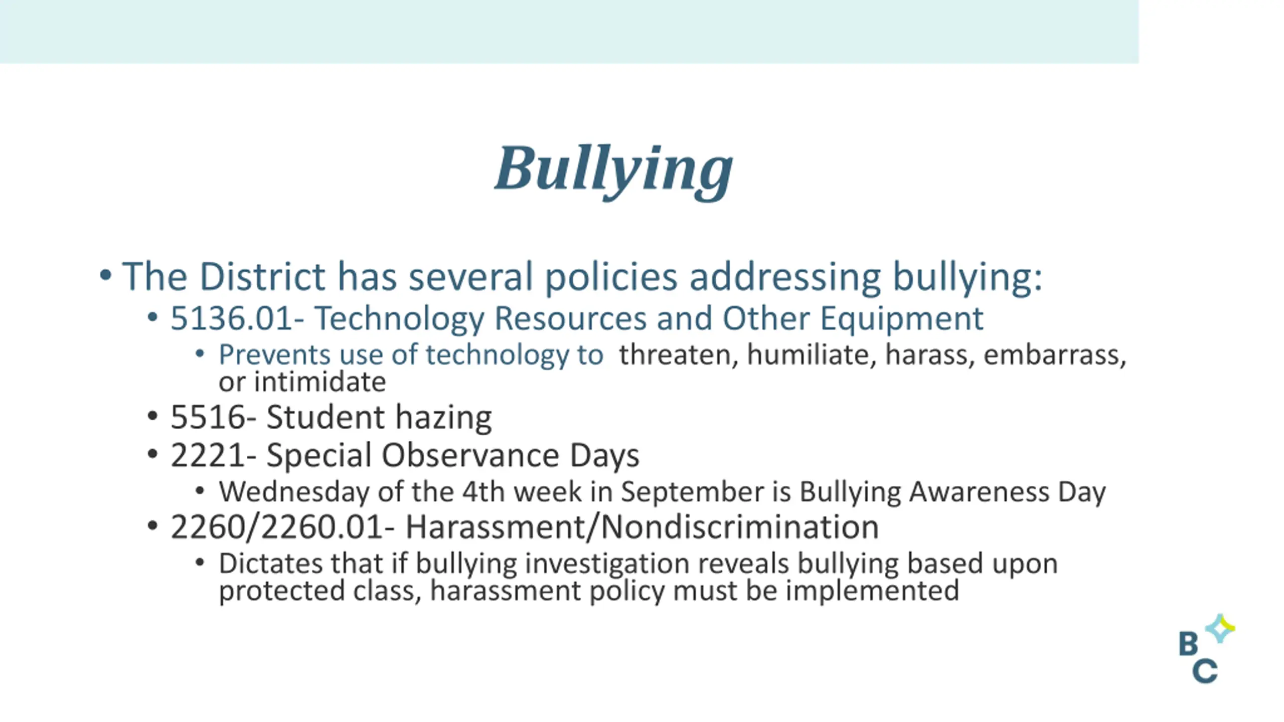 Bullying The District has several policies addressing bullying: 5136.01- Technology Resources and Other Equipment Prevents use of technology to threaten, humiliate, harass, embarrass, or intimidate 5516- Student hazing 2221- Special Observance Days Wednesday of the 4th week in September is Bullying Awareness Day 2260/2260.01- Harassment/Nondiscrimination Dictates that if bullying investigation reveals bullying based upon protected class, harassment policy must be implemented