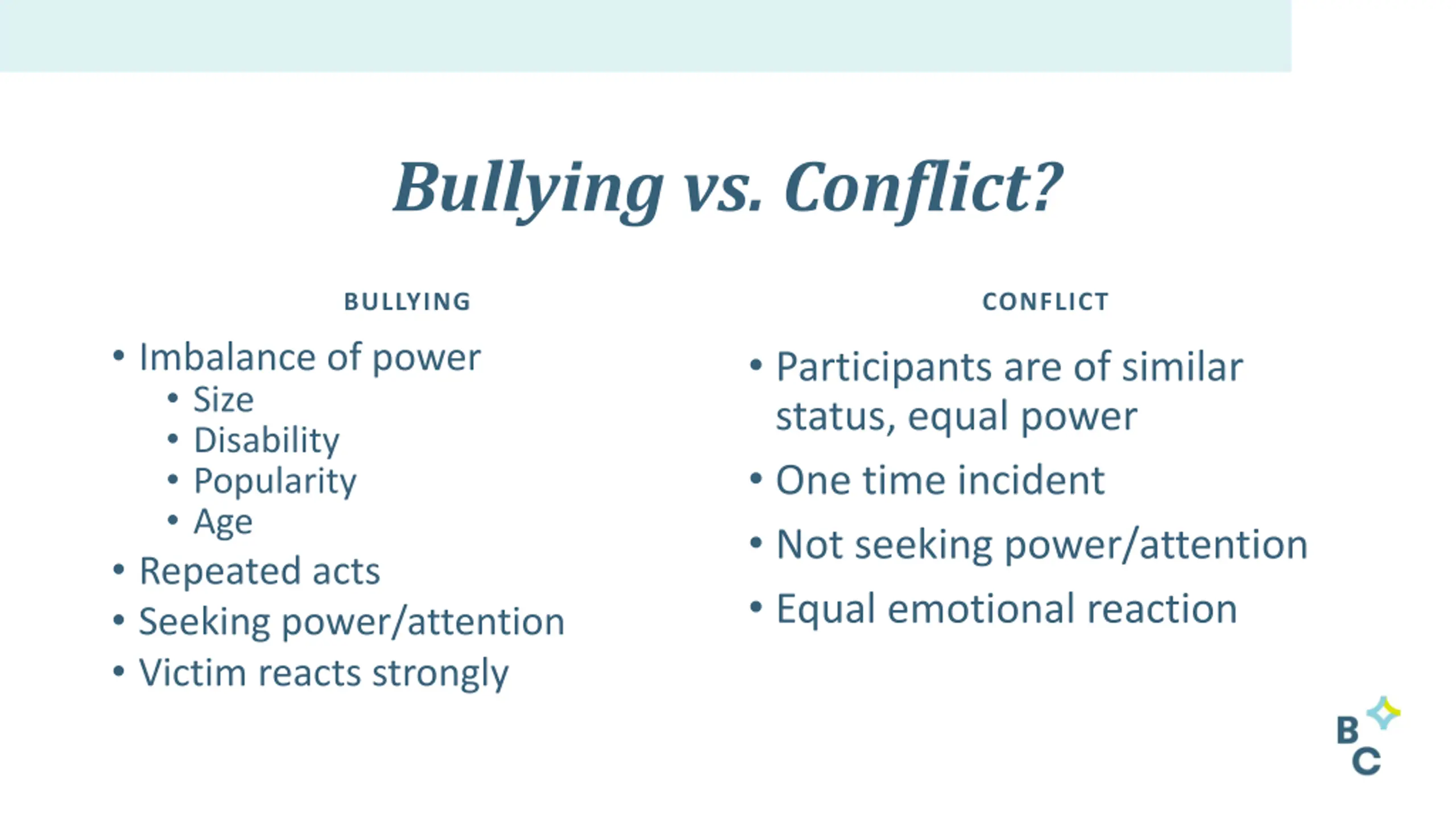 Bullying vs. Conflict? BULLYING CONFLICT Imbalance of power Size Disability Popularity Age Repeated acts Seeking power/attention Victim reacts strongly Participants are of similar status, equal power One time incident Not seeking power/attention Equal emotional reaction