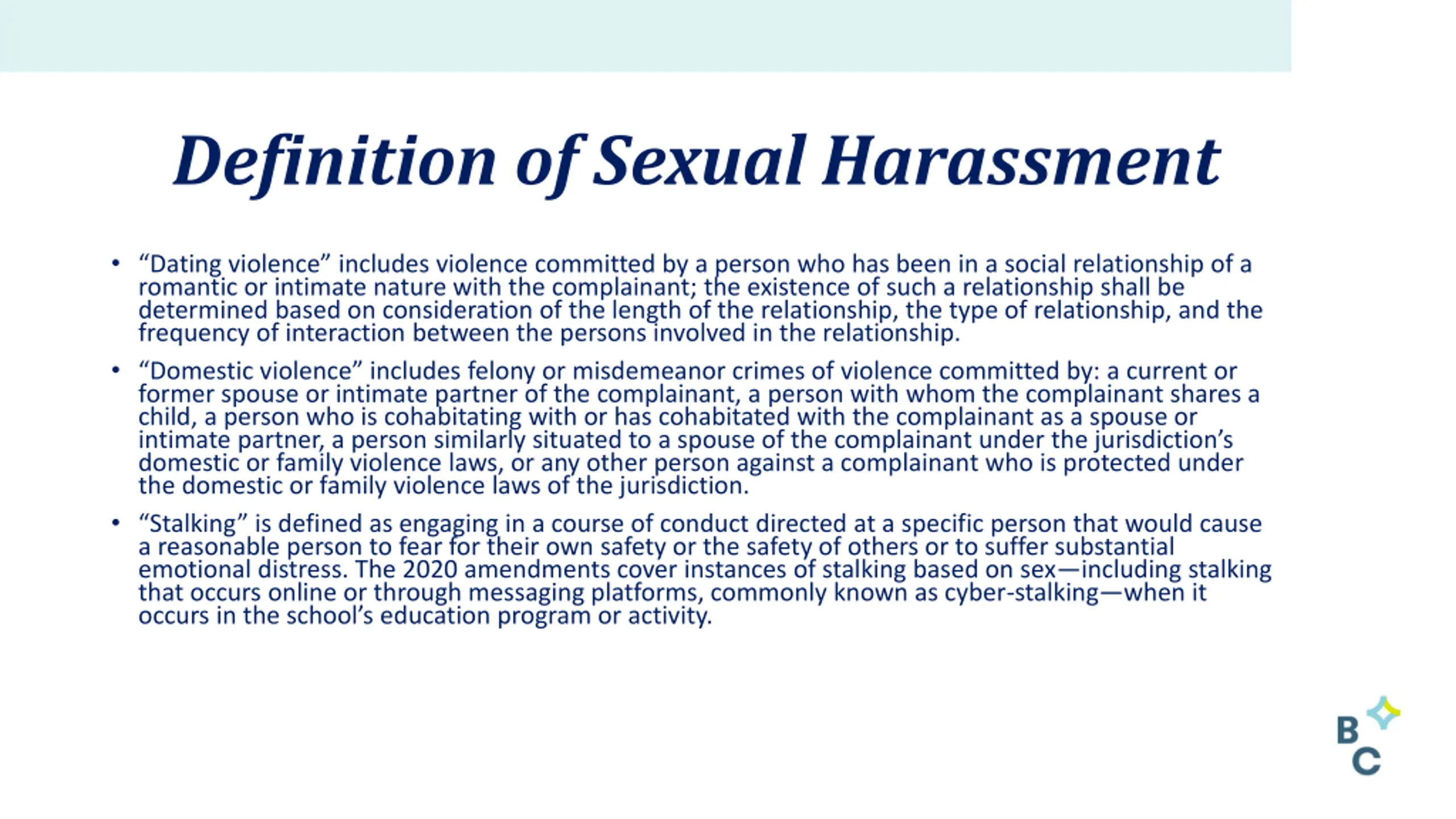 Definition of Sexual Harassment Dating violence includes violence committed by a person who has been in a social relationship of a romantic or intimate nature with the complainant; the existence of such a relationship shall be determined based on consideration of the length of the relationship, the type of relationship, and the frequency of interaction between the persons involved in the relationship. Domestic violence includes felony or misdemeanor crimes of violence committed by: a current or former spouse or intimate partner of the complainant, a person with whom the complainant shares a child, a person who is cohabitating with or has cohabitated with the complainant as a spouse or intimate partner, a person similarly situated to a spouse of the complainant under the jurisdiction s domestic or family violence laws, or any other person against a complainant who is protected under the domestic or family violence laws of the jurisdiction. Stalking is defined as engaging in a course of conduct directed at a specific person that would cause a reasonable person to fear for their own safety or the safety of others or to suffer substantial emotional distress. The 2020 amendments cover instances of stalking based on sex including stalking that occurs online or through messaging platforms, commonly known as cyber-stalking when it occurs in the school s education program or activity.