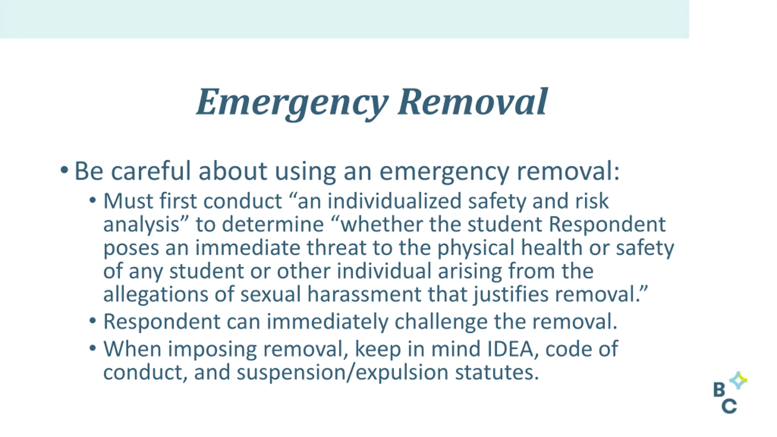 Emergency Removal Be careful about using an emergency removal: Must first conduct an individualized safety and risk analysis to determine whether the student Respondent poses an immediate threat to the physical health or safety of any student or other individual arising from the allegations of sexual harassment that justifies removal. Respondent can immediately challenge the removal. When imposing removal, keep in mind IDEA, code of conduct, and suspension/expulsion statutes.