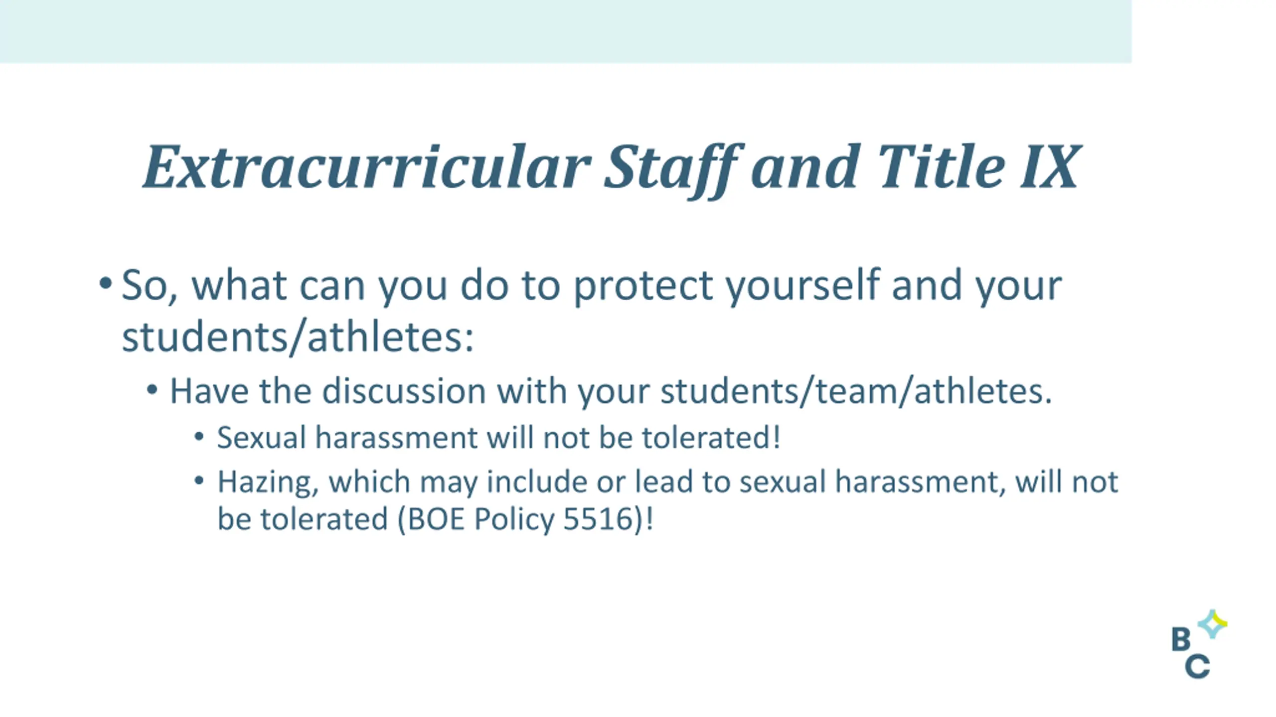 Extracurricular Staff and Title IX So, what can you do to protect yourself and your students/athletes: Have the discussion with your students/team/athletes. Sexual harassment will not be tolerated! Hazing, which may include or lead to sexual harassment, will not be tolerated (BOE Policy 5516)!