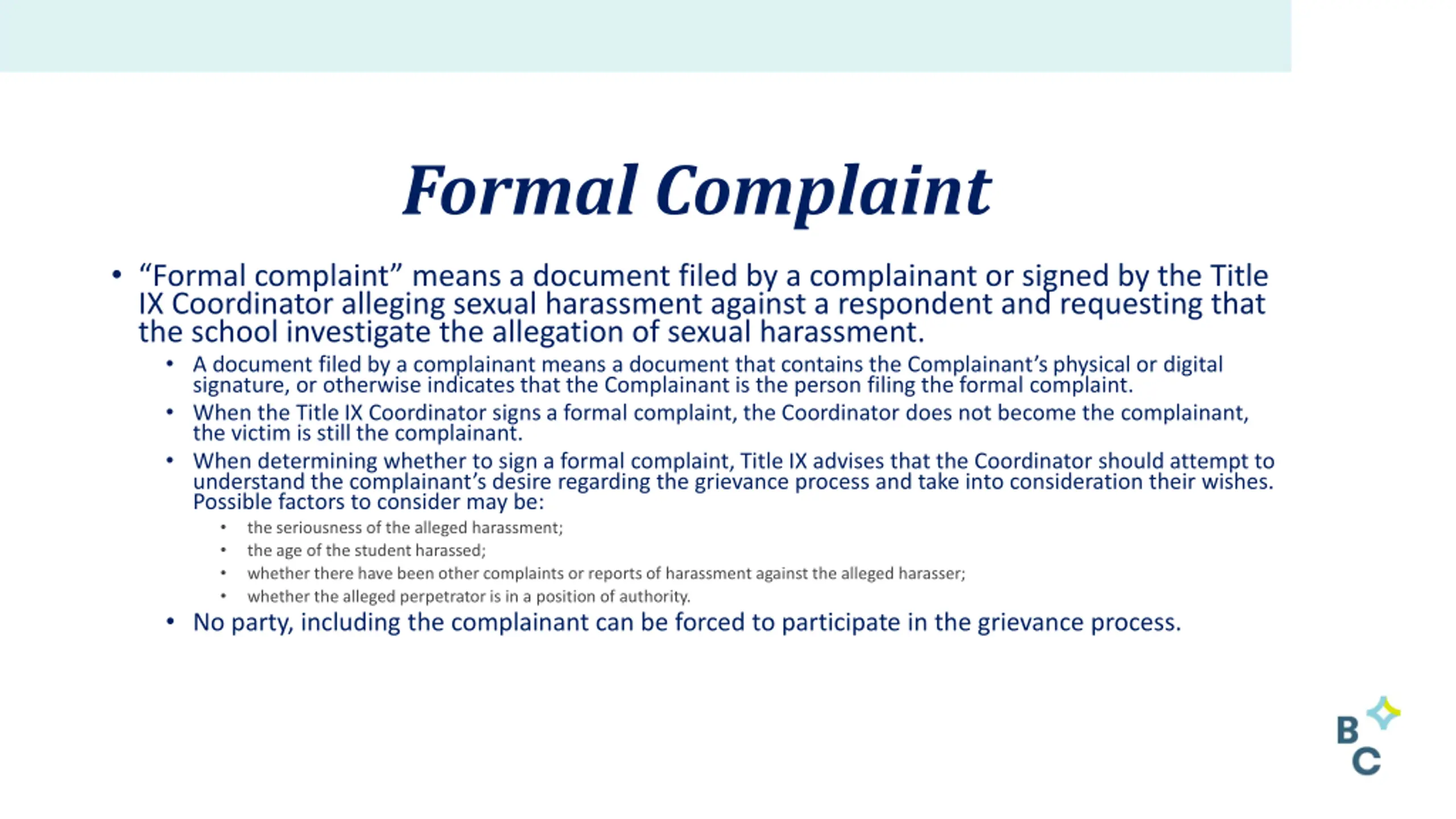 Formal Complaint Formal complaint means a document filed by a complainant or signed by the Title IX Coordinator alleging sexual harassment against a respondent and requesting that the school investigate the allegation of sexual harassment. A document filed by a complainant means a document that contains the Complainant s physical or digital signature, or otherwise indicates that the Complainant is the person filing the formal complaint. When the Title IX Coordinator signs a formal complaint, the Coordinator does not become the complainant, the victim is still the complainant. When determining whether to sign a formal complaint, Title IX advises that the Coordinator should attempt to understand the complainant s desire regarding the grievance process and take into consideration their wishes. Possible factors to consider may be: the seriousness of the alleged harassment; the age of the student harassed; whether there have been other complaints or reports of harassment against the alleged harasser; whether the alleged perpetrator is in a position of authority. No party, including the complainant can be forced to participate in the grievance process.