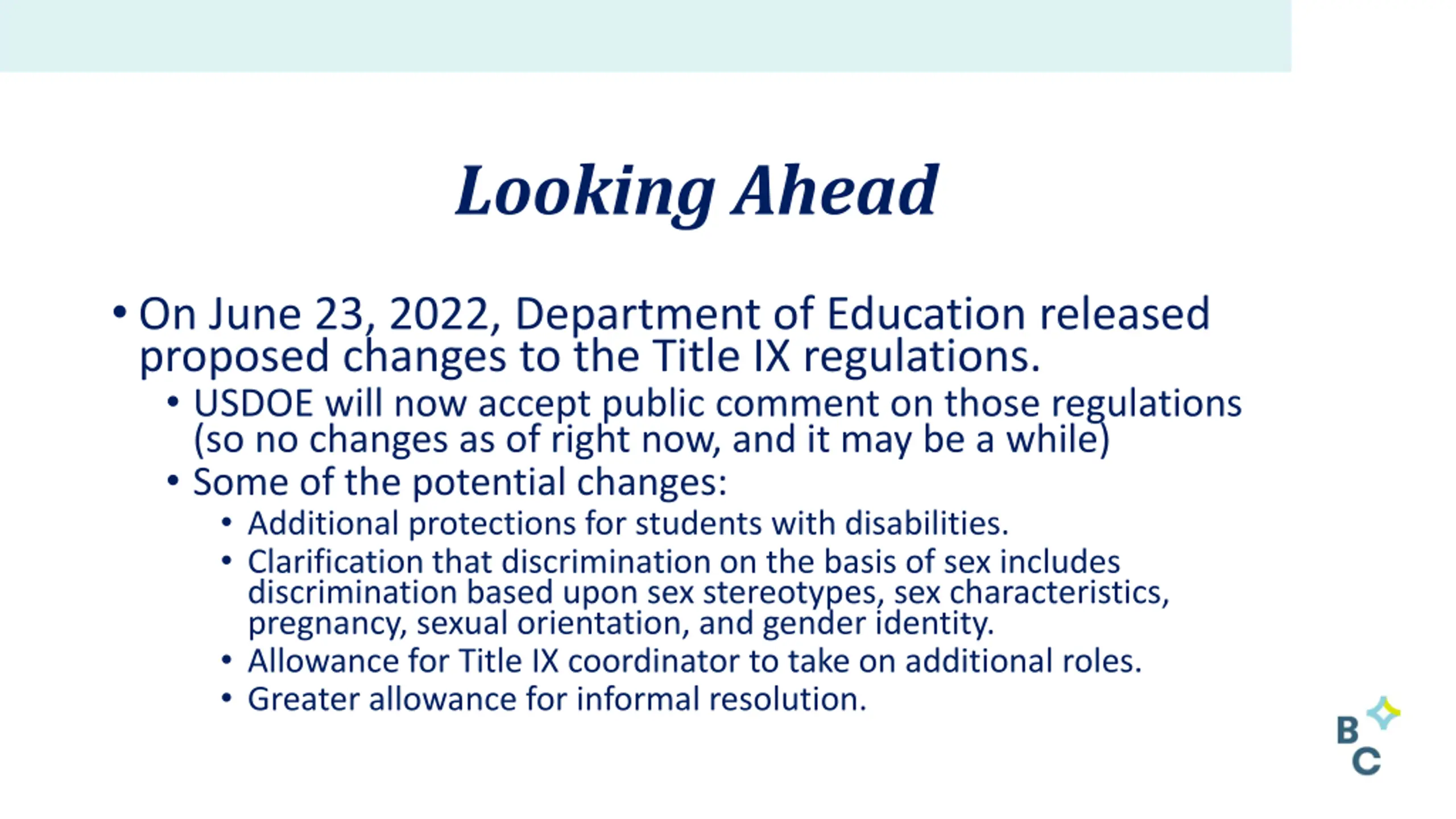 Looking Ahead On June 23, 2022, Department of Education released proposed changes to the Title IX regulations. USDOE will now accept public comment on those regulations (so no changes as of right now, and it may be a while) Some of the potential changes: Additional protections for students with disabilities. Clarification that discrimination on the basis of sex includes discrimination based upon sex stereotypes, sex characteristics, pregnancy, sexual orientation, and gender identity. Allowance for Title IX coordinator to take on additional roles. Greater allowance for informal resolution.