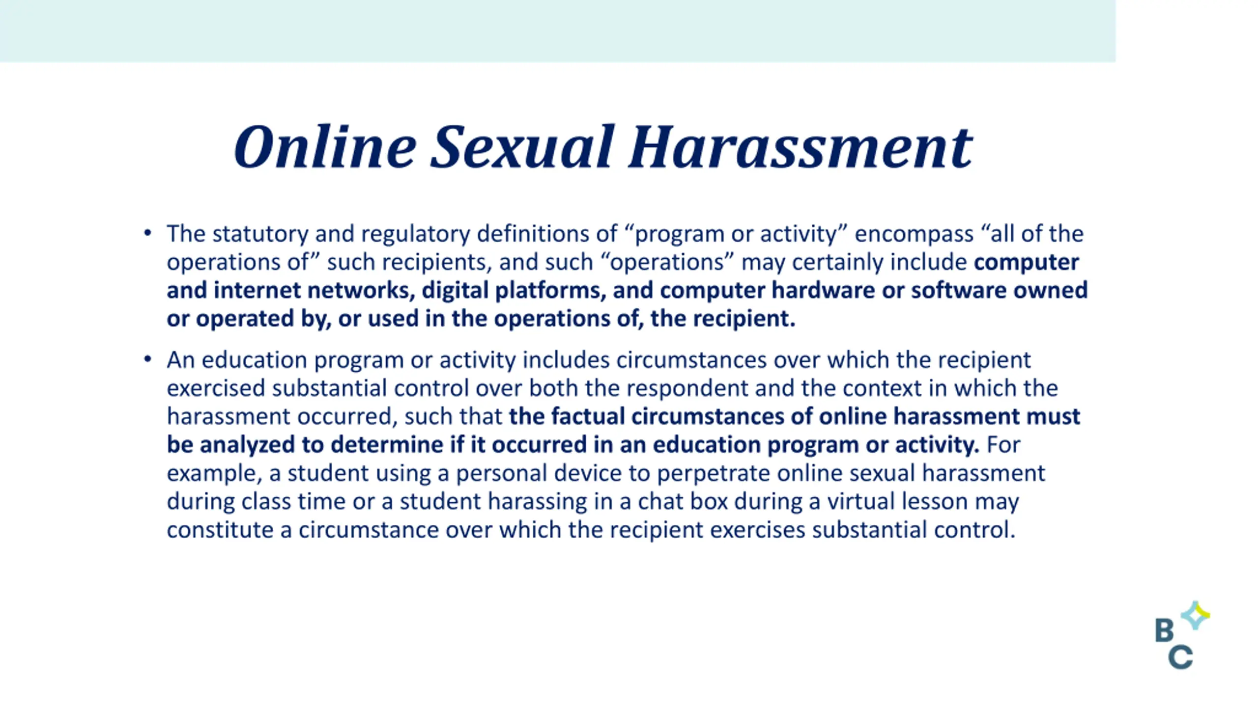 Online Sexual Harassment The statutory and regulatory definitions of program or activity encompass all of the operations of such recipients, and such operations may certainly include computer and internet networks, digital platforms, and computer hardware or software owned or operated by, or used in the operations of, the recipient. An education program or activity includes circumstances over which the recipient exercised substantial control over both the respondent and the context in which the harassment occurred, such that the factual circumstances of online harassment must be analyzed to determine if it occurred in an education program or activity. For example, a student using a personal device to perpetrate online sexual harassment during class time or a student harassing in a chat box during a virtual lesson may constitute a circumstance over which the recipient exercises substantial control.