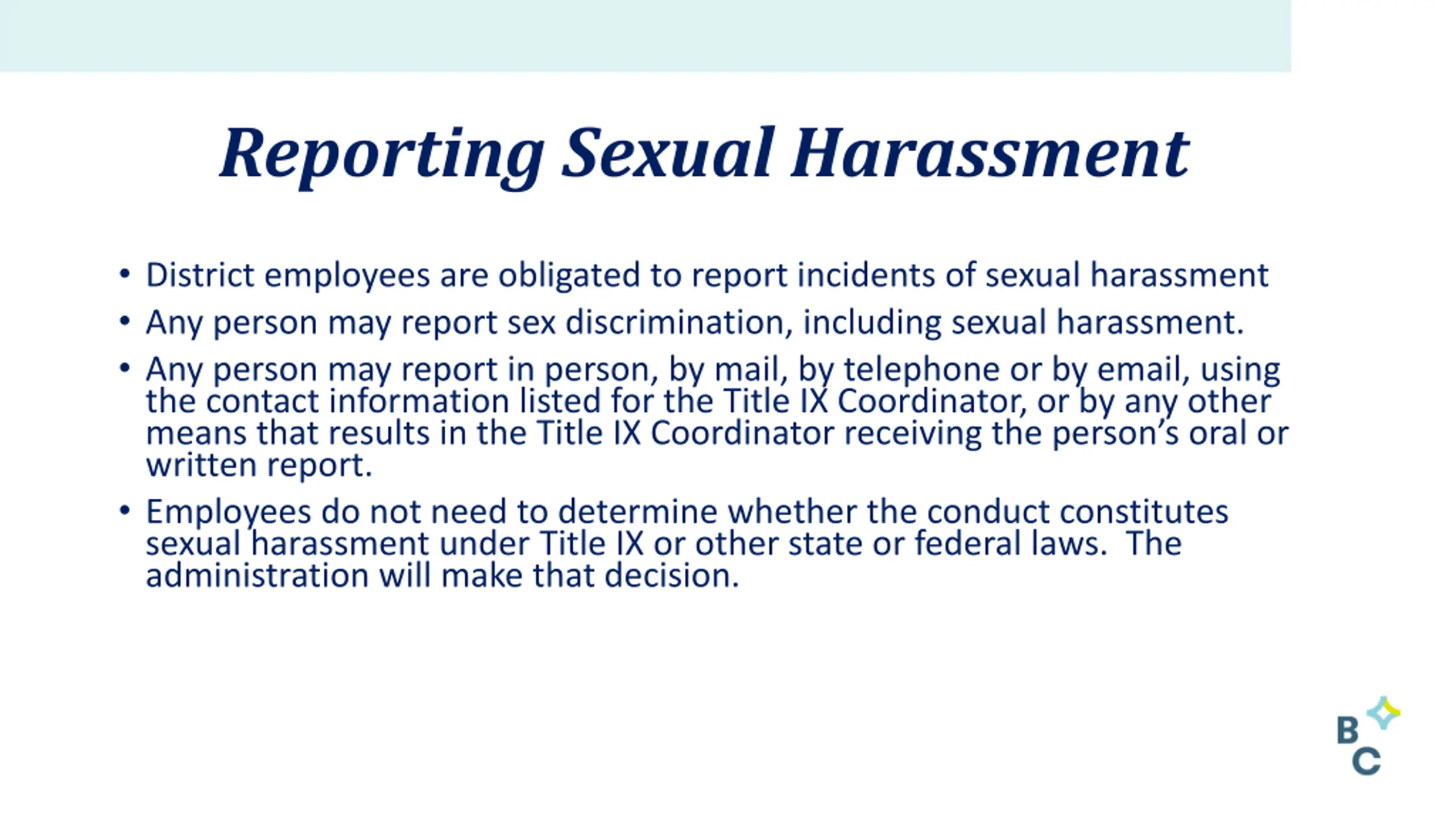 Reporting Sexual Harassment District employees are obligated to report incidents of sexual harassment Any person may report sex discrimination, including sexual harassment. Any person may report in person, by mail, by telephone or by email, using the contact information listed for the Title IX Coordinator, or by any other means that results in the Title IX Coordinator receiving the person s oral or written report. Employees do not need to determine whether the conduct constitutes sexual harassment under Title IX or other state or federal laws. The administration will make that decision.