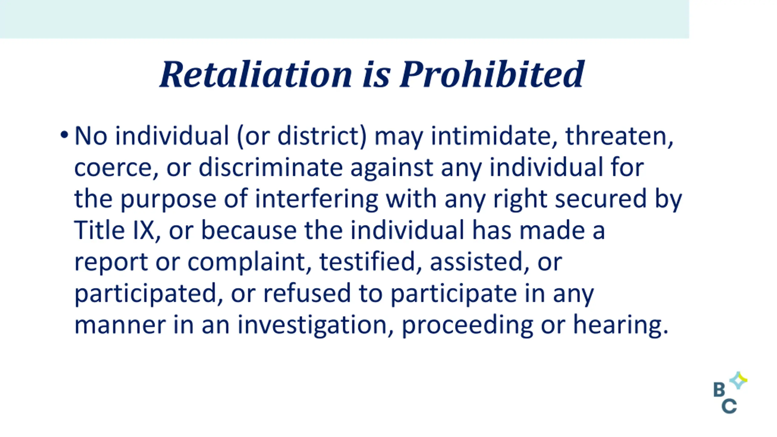 Retaliation is Prohibited No individual (or district) may intimidate, threaten, coerce, or discriminate against any individual for the purpose of interfering with any right secured by Title IX, or because the individual has made a report or complaint, testified, assisted, or participated, or refused to participate in any manner in an investigation, proceeding or hearing.