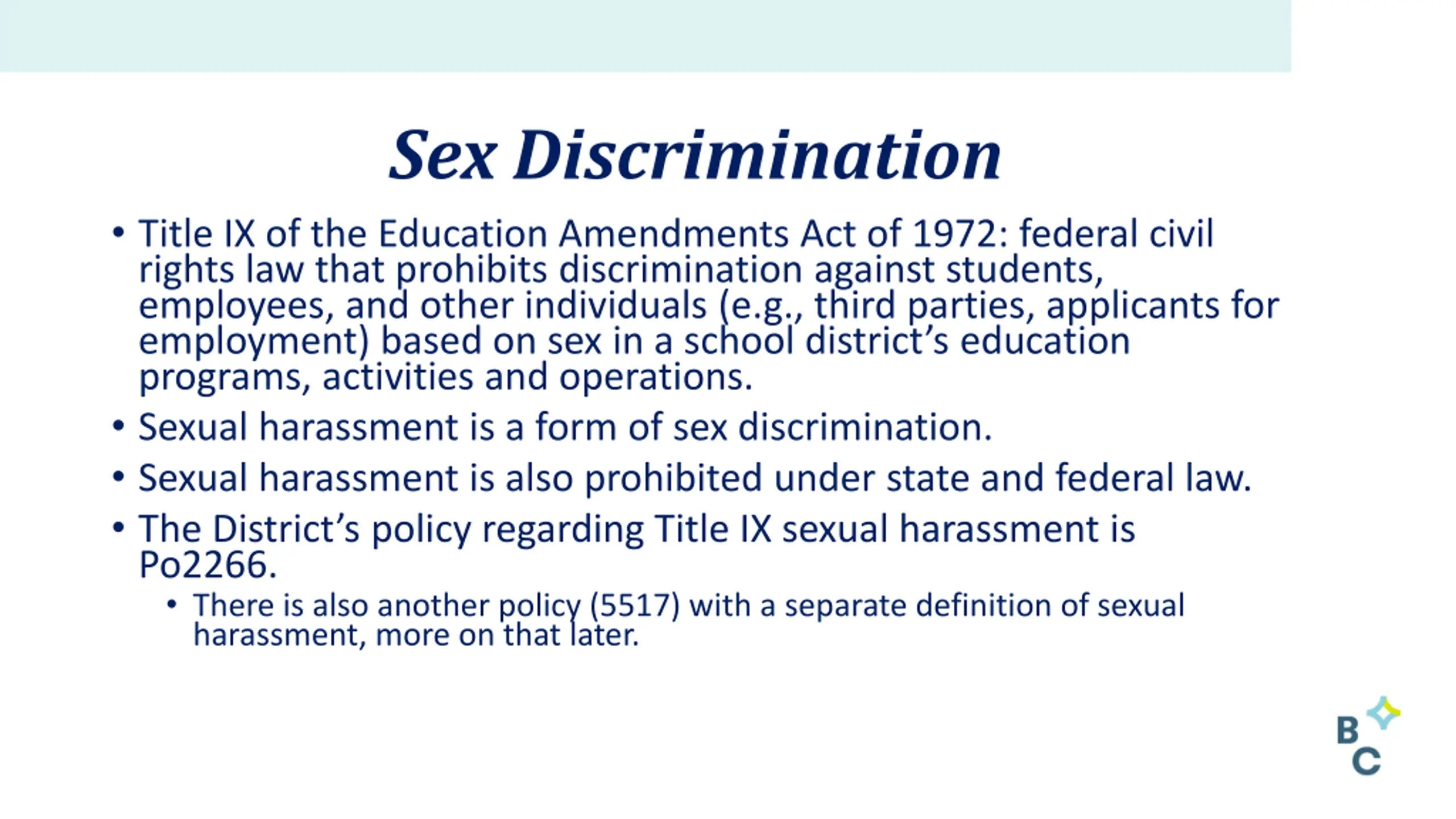 Sex Discrimination Title IX of the Education Amendments Act of 1972: federal civil rights law that prohibits discrimination against students, employees, and other individuals (e.g., third parties, applicants for employment) based on sex in a school district s education programs, activities and operations. Sexual harassment is a form of sex discrimination. Sexual harassment is also prohibited under state and federal law. The District s policy regarding Title IX sexual harassment is Po2266. There is also another policy (5517) with a separate definition of sexual harassment, more on that later.