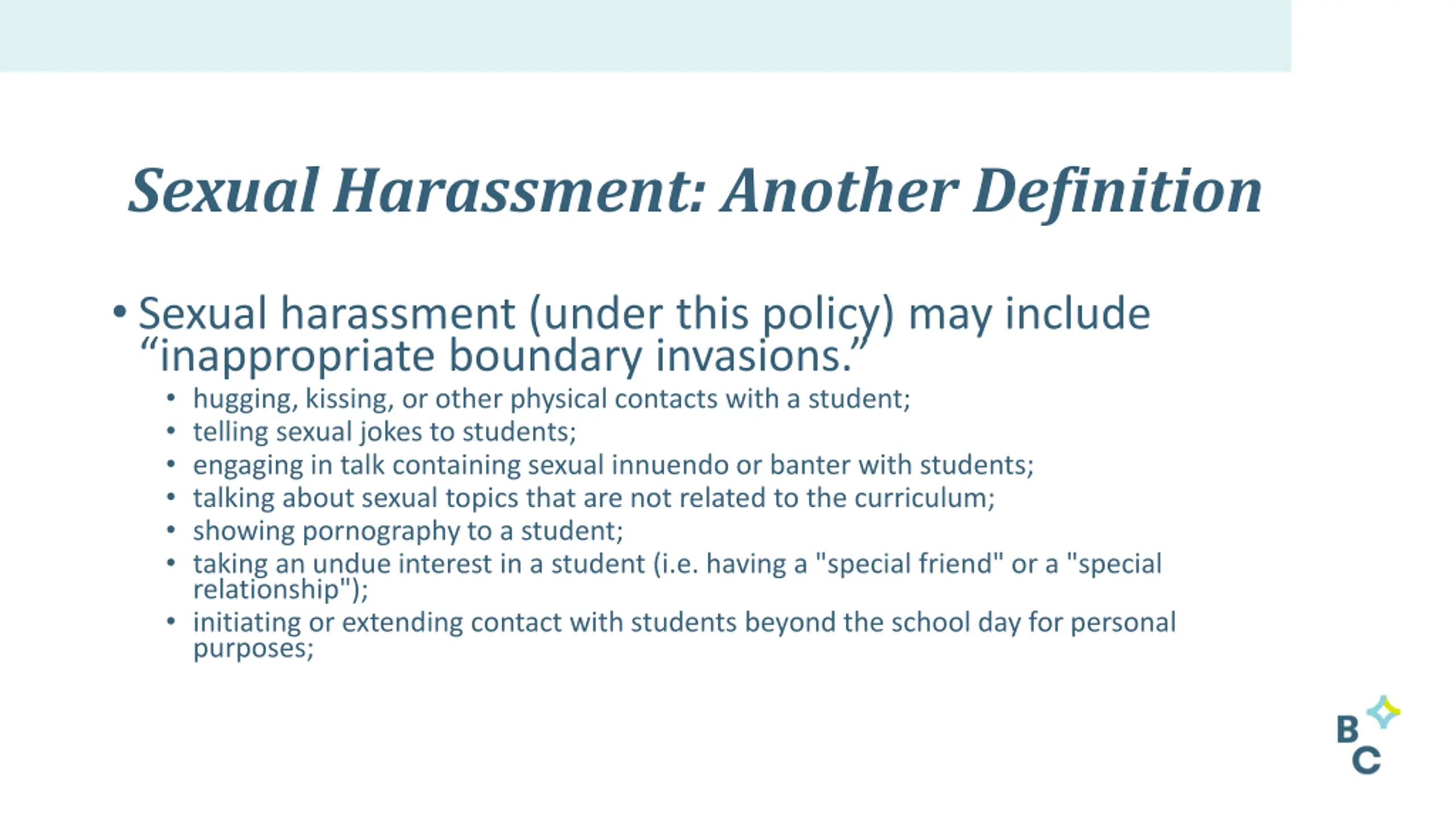 Sexual Harassment: Another Definition Sexual harassment (under this policy) may include inappropriate boundary invasions. hugging, kissing, or other physical contacts with a student; telling sexual jokes to students; engaging in talk containing sexual innuendo or banter with students; talking about sexual topics that are not related to the curriculum; showing pornography to a student; taking an undue interest in a student (i.e. having a "special friend" or a "special relationship"); initiating or extending contact with students beyond the school day for personal purposes;