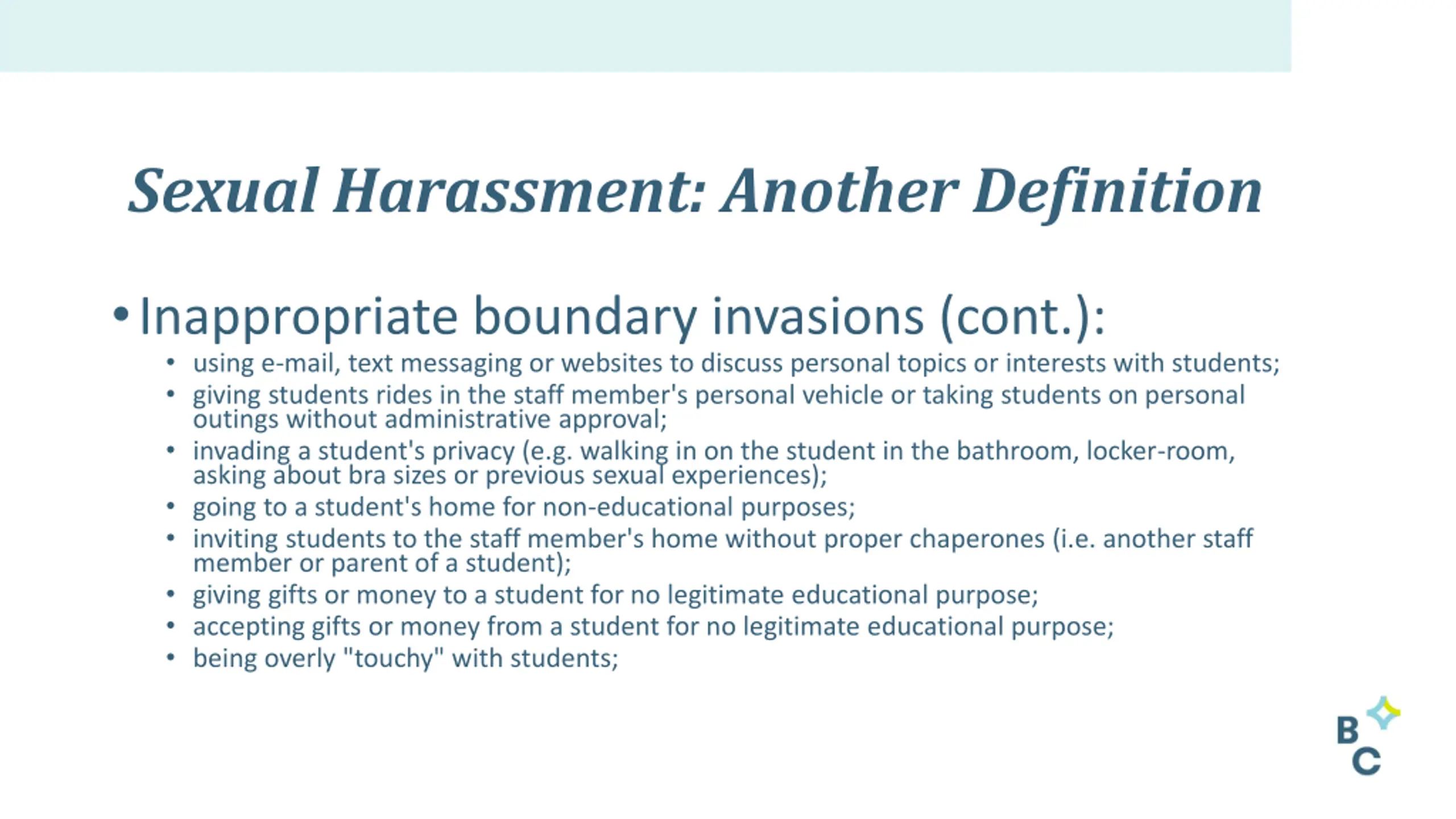 Sexual Harassment: Another Definition Inappropriate boundary invasions (cont.): using e-mail, text messaging or websites to discuss personal topics or interests with students; giving students rides in the staff member's personal vehicle or taking students on personal outings without administrative approval; invading a student's privacy (e.g. walking in on the student in the bathroom, locker-room, asking about bra sizes or previous sexual experiences); going to a student's home for non-educational purposes; inviting students to the staff member's home without proper chaperones (i.e. another staff member or parent of a student); giving gifts or money to a student for no legitimate educational purpose; accepting gifts or money from a student for no legitimate educational purpose; being overly "touchy" with students;