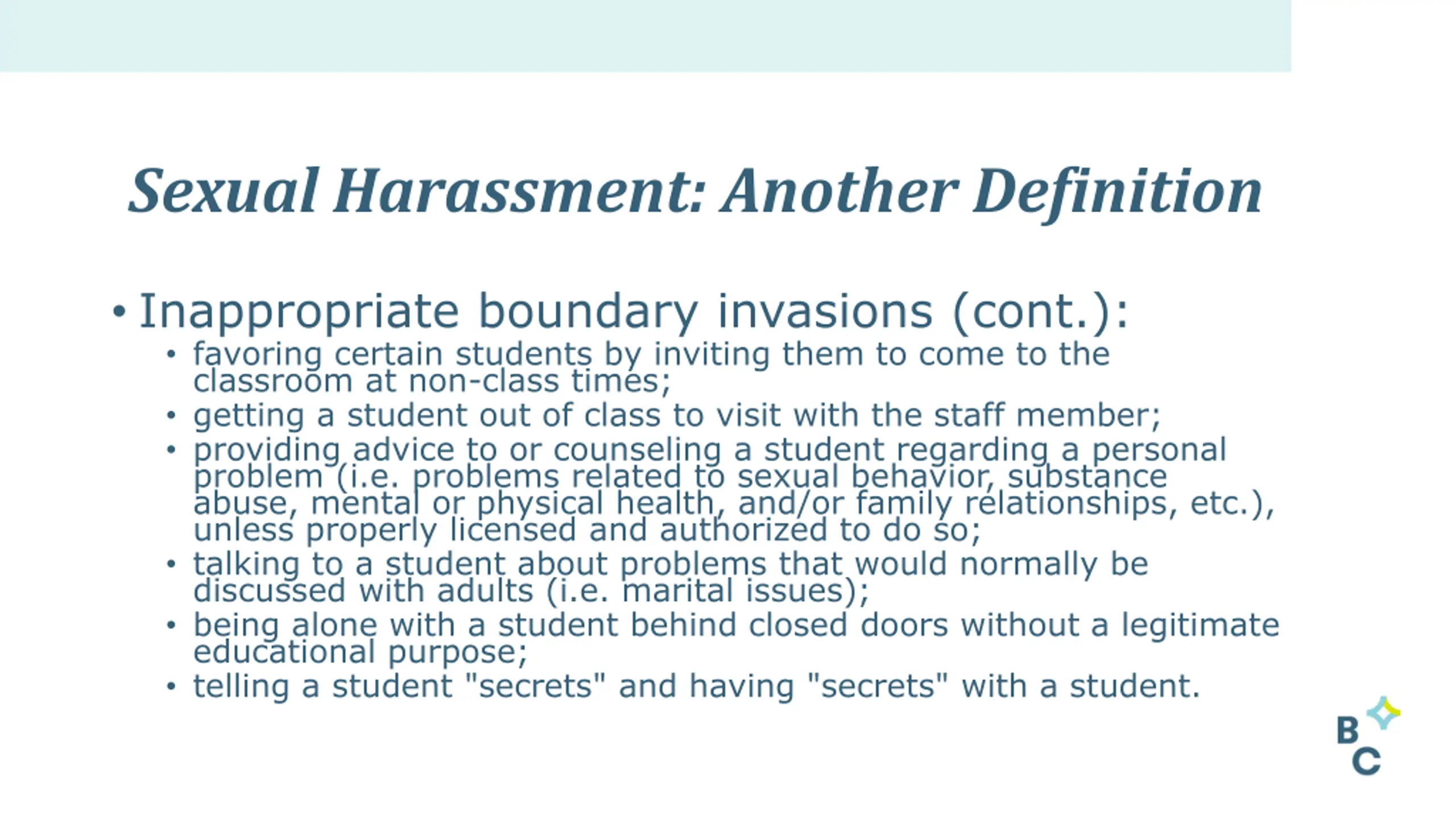 Sexual Harassment: Another Definition Inappropriate boundary invasions (cont.): favoring certain students by inviting them to come to the classroom at non-class times; getting a student out of class to visit with the staff member; providing advice to or counseling a student regarding a personal problem (i.e. problems related to sexual behavior, substance abuse, mental or physical health, and/or family relationships, etc.), unless properly licensed and authorized to do so; talking to a student about problems that would normally be discussed with adults (i.e. marital issues); being alone with a student behind closed doors without a legitimate educational purpose; telling a student "secrets" and having "secrets" with a student.